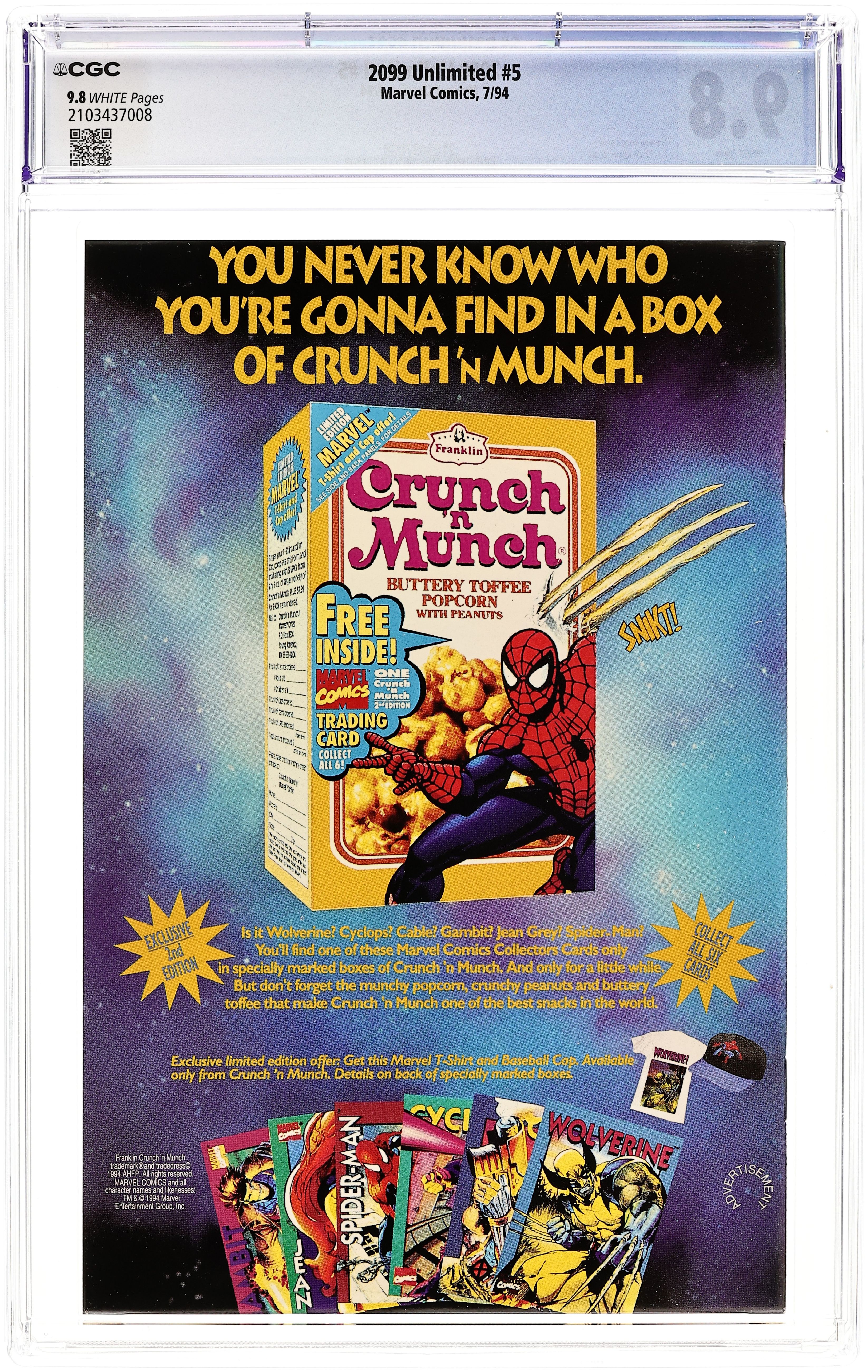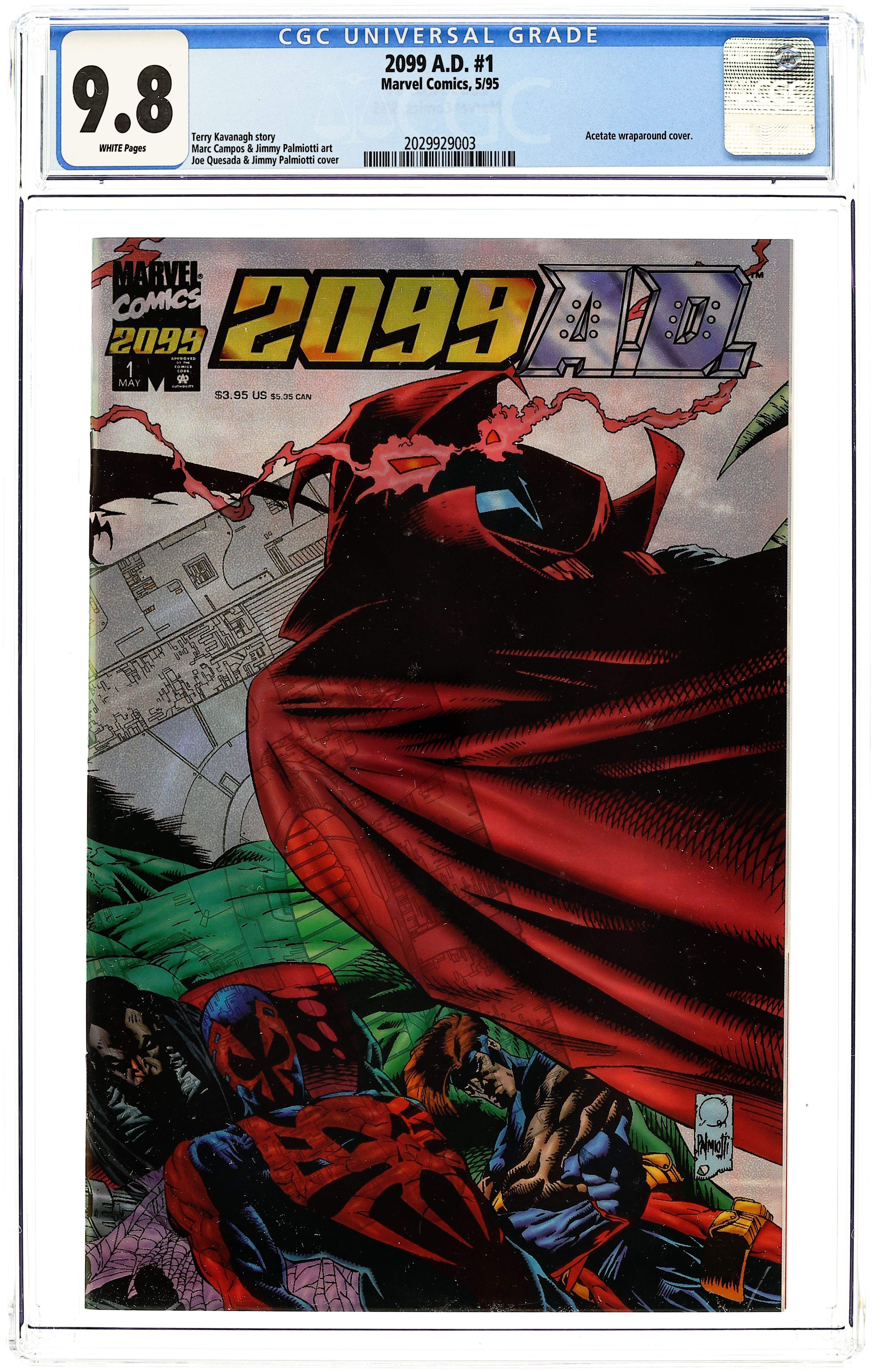 Acetate cover, pencils by Joe Quesada, inks by Jimmy Palmiotti, colors by Angus McKie. "Everything Is Fair," script by Terry Kavanagh, pencils by Marc Campos, inks by Jimmy Palmiotti; Doom 2099 consults with his Black Cabinet; Lohengrin is confronted by Polymire and Septymbre for an artifact; Hulk 2099 considers using an alien jar to bring Gawain back to life; Doom 2099 recruits Ghost Rider 2099; Spider-Man 2099 is informed of Doom's plans by Punisher 2099; Bloodhawk finds a hidden vault, while Meanstreak and Halloween Jack look for an artifact; Spider-Man, Punisher, X-Men and Ghost Rider come together to stop Septymbre from bringing back Wintre. 52 pgs., full color. Cover price $3.95.