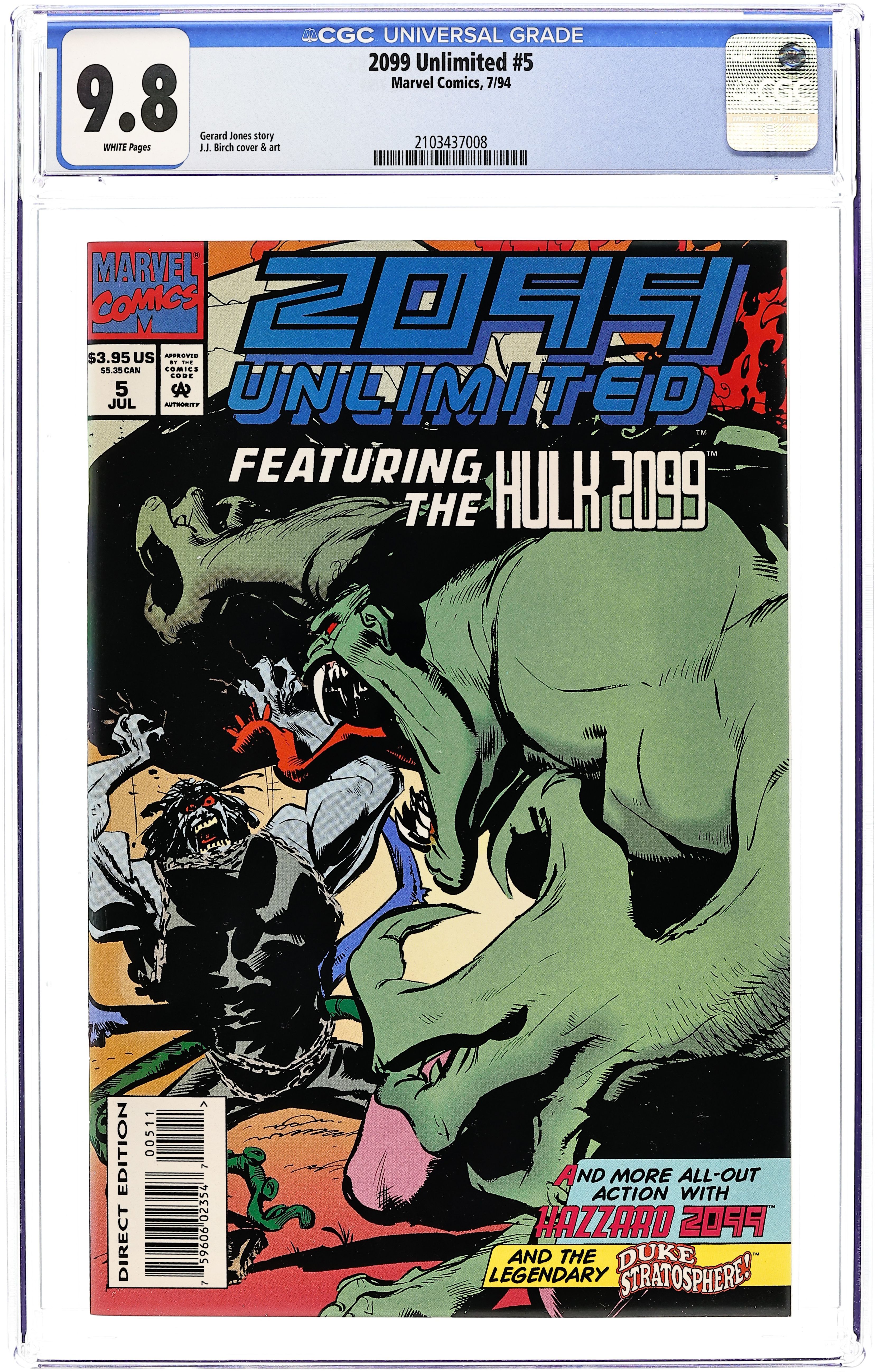 Direct Edition. Cover by Chris Wozniak. 1st app of Hulk 2099 in "Nothing Ever Changes," script by Evan Skolnik, pencils by Chris Wozniak, inks by Chris Ivy; Mutagen is planning on eliminating Homo-inferior; as he calls normal humans; for starters he chooses the hospital one of Spider-Mans friends is in; It is a long hard battle but Spidey is victorious in the end, though Mutagen does get away. Untitled story, script by Gerard Jones, art by Dwayne Turner; Hulk comes out of a six day anger binge to find that his current project at work has been reassigned due to his absence; While researching his next job he comes across evidence that leads him to discover a contract on Naomi. 68 pgs., full color. $3.95. Cover price $3.95.