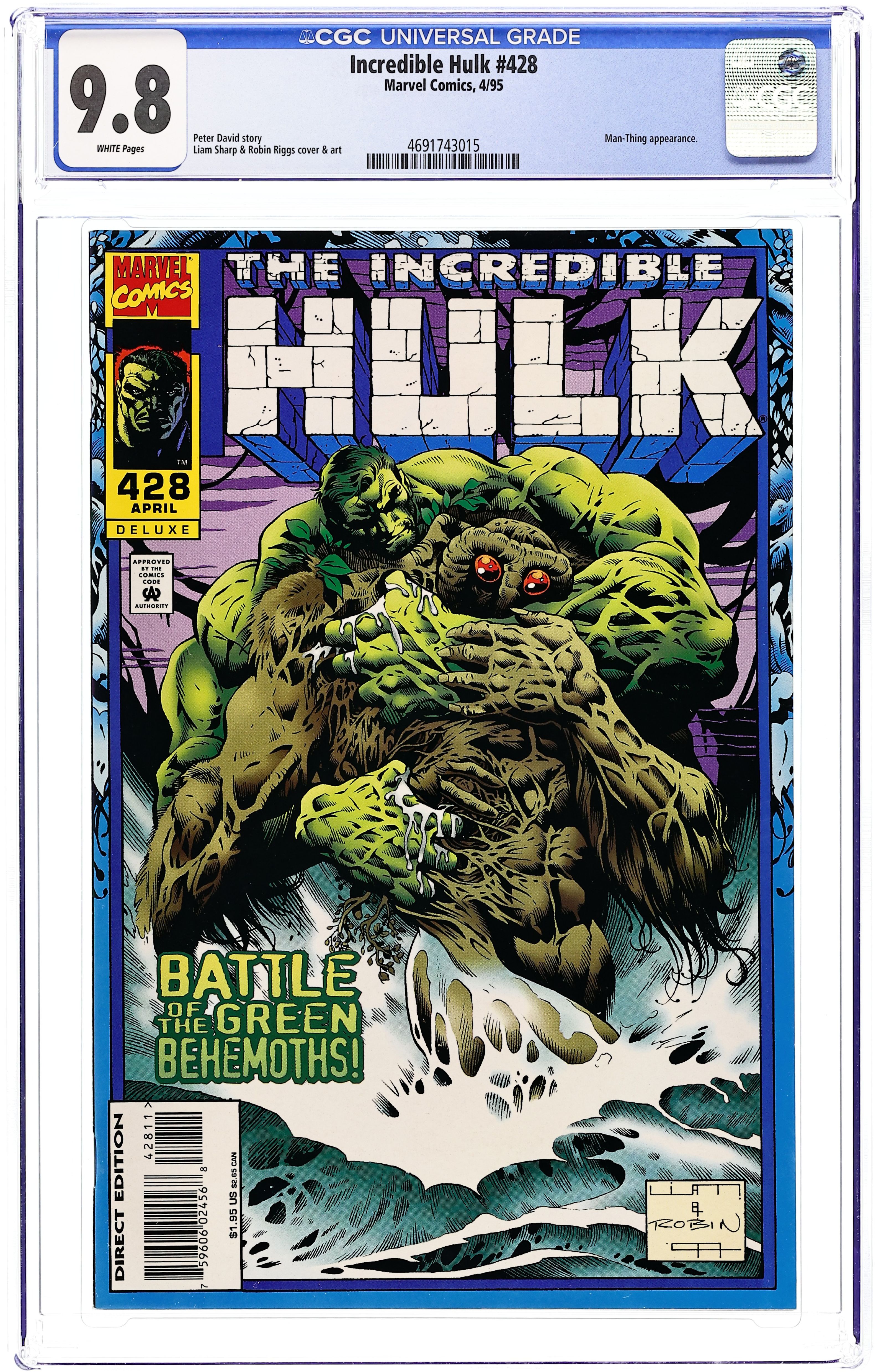First Printing. Direct Edition. "Honey, I Shrunk the Hulk." Guest-starring Doc Samson. Story by Peter David. Art by Dale Keown and Bob McLeod. Ever wonder why the Hulk is so darn mad all the time? Super psychiatrist Doc Samson sits down with perhaps the most fractured psyche in the world and finds out what makes Bruce Banner tick. Samson, grey Hulk, green Hulk, and Banner delve deep into the scientist's sub-conscious and what they find will shock you. By story's end Bruce Banner and the Hulk will never be the same again. 40 pages. Cover price $1.00.