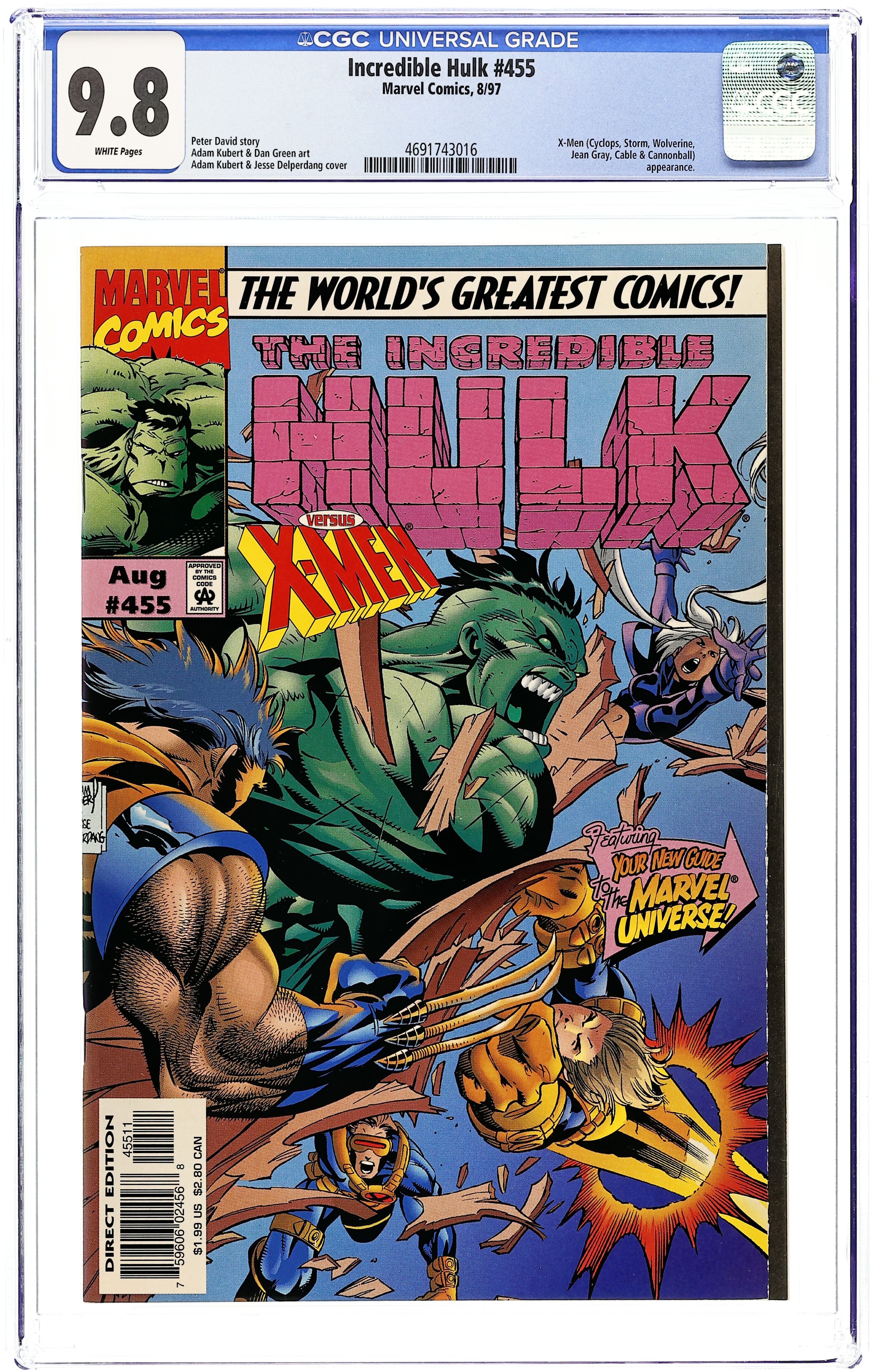 "Waiting to X-Hale!" Guest-starring the X-Men (Wolverine, Cyclops, Storm, Cable, Forge, and Cannonball). Story by Peter David. Art by Adam Kubert and Dan Green. After the Hulk collapses in the Savage Land, Wolverine, even if his teammates disapprove, brings the Hulk to the X-Mansion to recover. What will happen when the Hulk awakes? Think he'll be happy? Don't bet on it. Plus, the return of one of Hulk's oldest nemesis. 46 pages. Cover price $1.99.