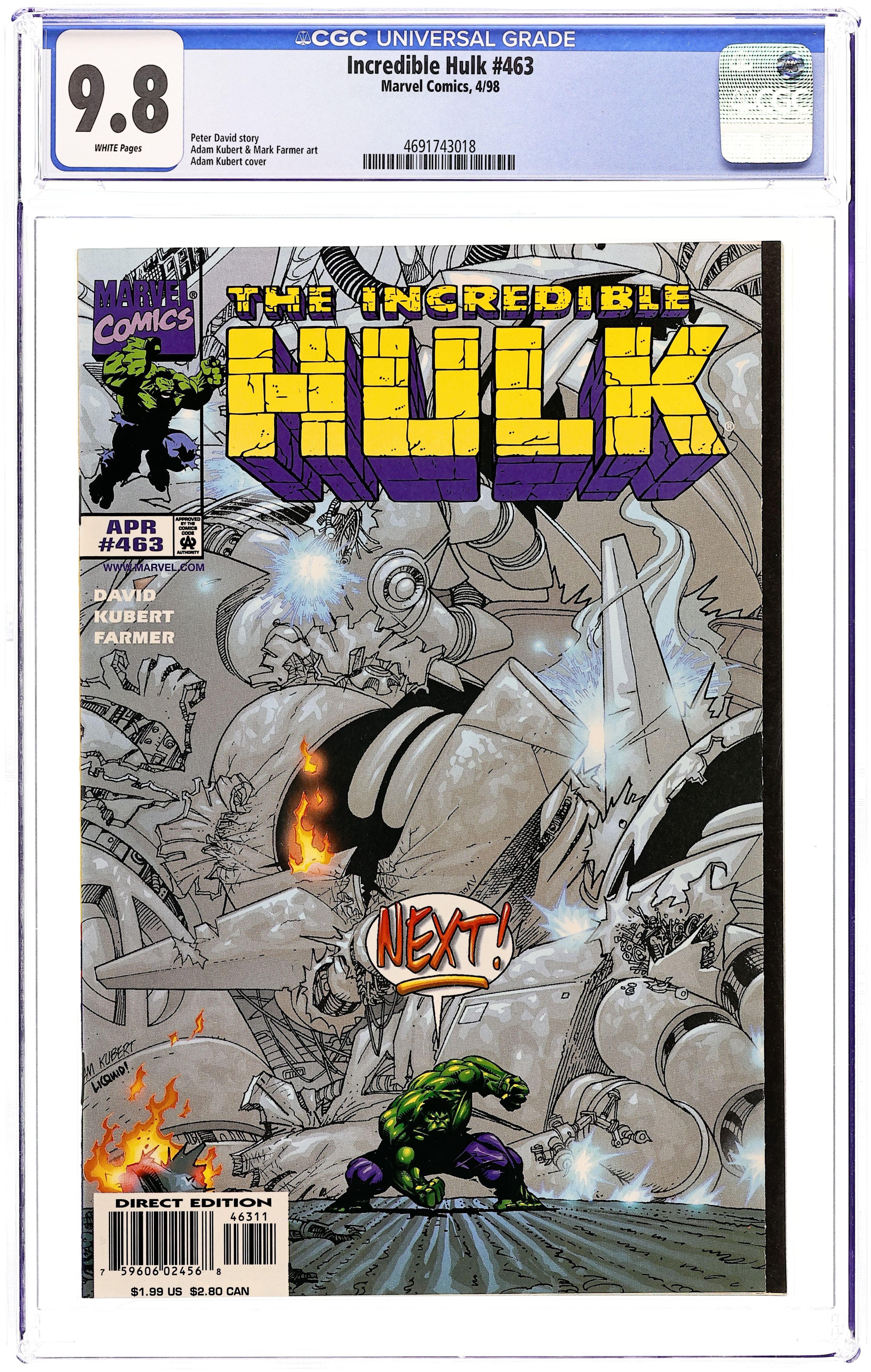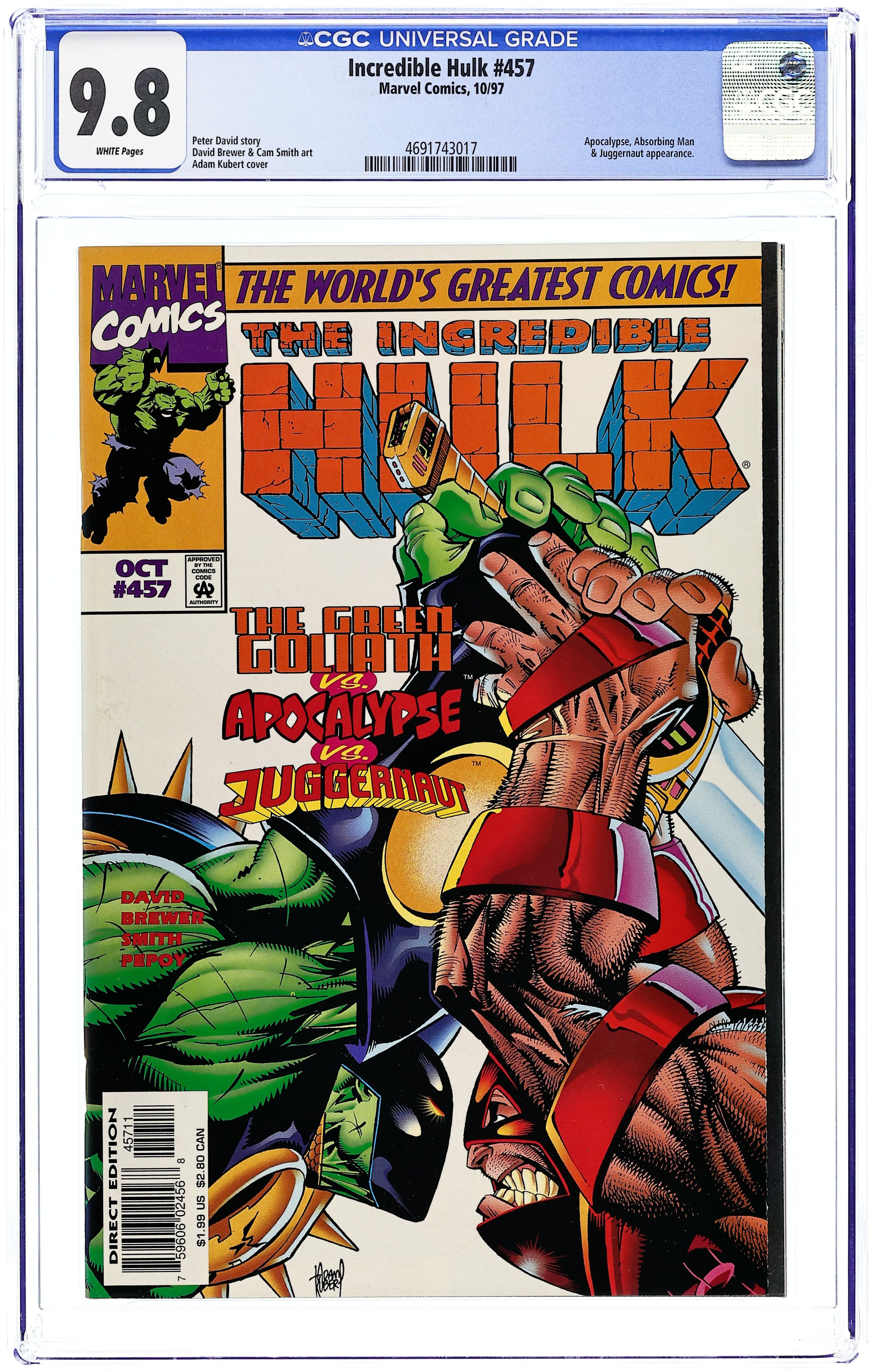 Direct Edition. Story by Peter David. Art by Dale Keown and Bob McLeod. What do get when you combine the intelligence of Bruce Banner, the cunning of the grey Hulk, and the unparalleled might of the green Hulk? You get the new and improved Hulk. In the startling aftermath of issue #377, a brand new direction for the Green Goliath. 36 pages. Cover price $1.00.