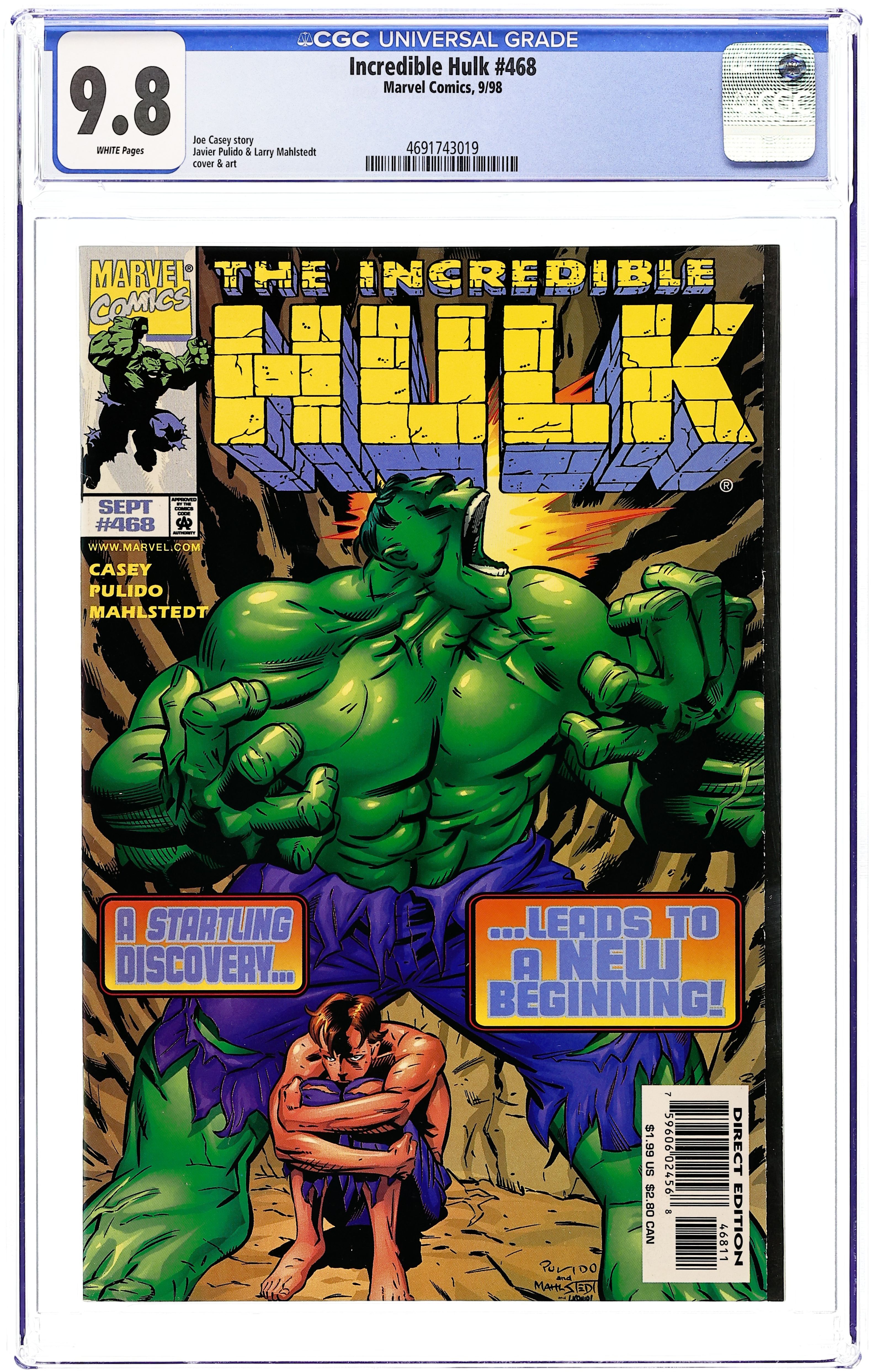Cover pencils by Javier Pulido, inks by Larry Mahlstedt. A Dark Green Life, script by Joe Casey, pencils by Javier Pulido, inks by Larry Mahlstedt; Bruce Banner sneaks back into the new Hulkbuster Base to investigate if he caused Betty's death; Dr. Katherine Spar joins the research team on the base for the same reason; The Hulk rampages through the base. 36 pgs. $1.99. Cover price $1.99.