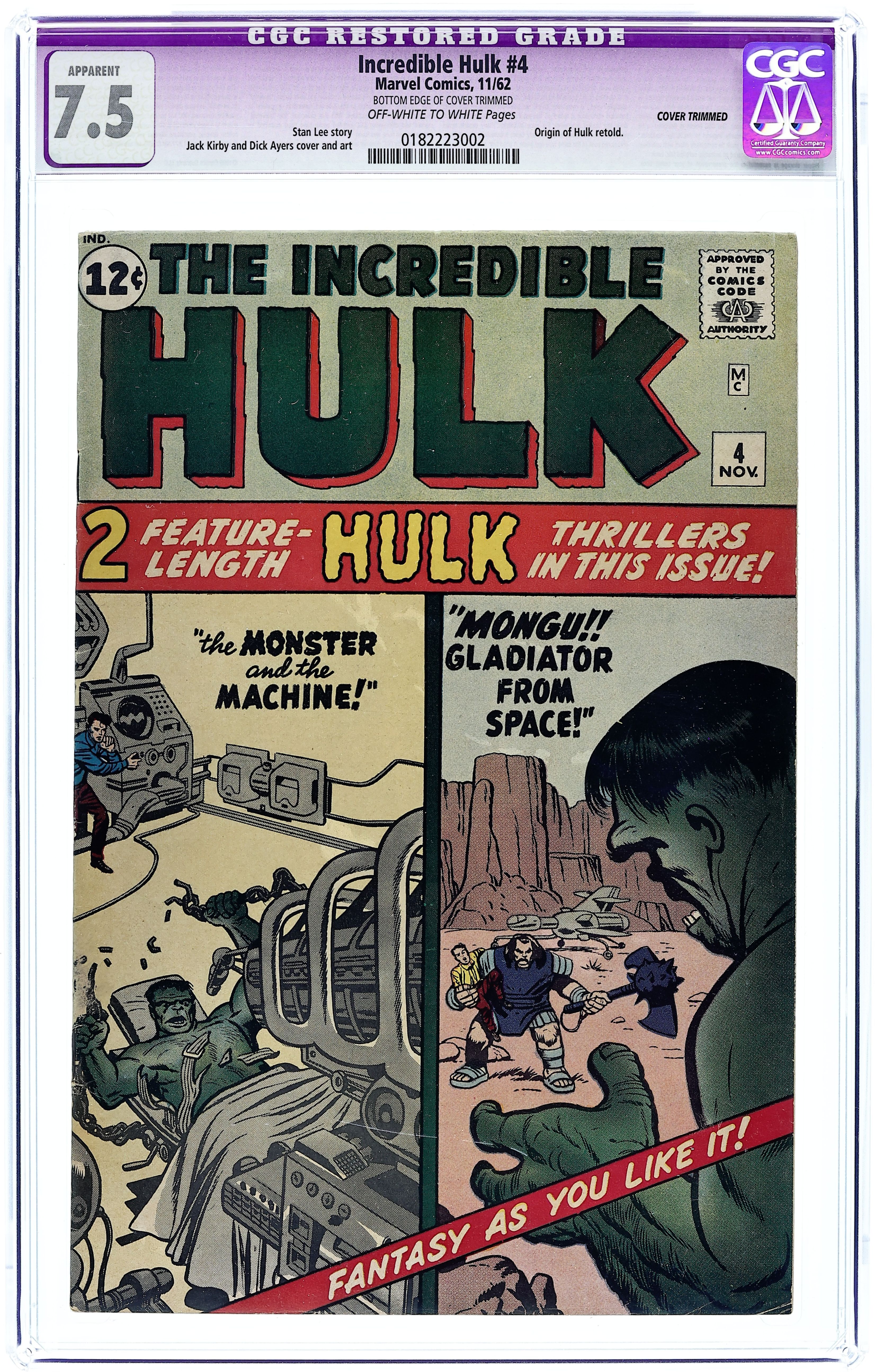 The first appearance and origin of the Incredible Hulk in "The Coming of the Hulk." Script by Stan Lee, pencils by Jack Kirby, inks by Paul Reinman. 1st app. Rick Jones, General Ross, and Betty Ross. It's the height of the Cold War and the government is about to test their new Gamma Bomb. Unfortunately, a carefree and oblivious teenager named Rick Jones wanders out onto the test area. Dr. Bruce Banner, the creator of the Gamma Bomb, rushes out to warn the young man away. However, the bomb explodes and as Banner pushes the teenager to safety he is caught in the heart of a Gamma maelstrom. The gamma-rays that bombard Banner's thin frame transform his physiology. Now, whenever Banner becomes angry he transforms into the man-brute known as the Incredible Hulk. Feared by the public and hunted by the army, the Hulk becomes one of the most tragic figures in Marvel's history. General "Thunderbolt" Ross will not rest until the Hulk is destroyed. The creature's only allies are Rick Jones and Betty Ross, Thunderbolt's daughter and Banner's one true love. Thus begins the epic saga of the world's mightiest mortal. NOTE: Notice that the Hulk was colored grey for the first few issues of his series. In an interview, Stan Lee (creator) said very simply that the reason for this was that grey was the easiest color for the copiers of the time to print. When the technology got better the Hulk became green, and according to Stan, for no better reason than they didn't have a green hero in their stable yet. 36 pgs. Cover price $0.12.