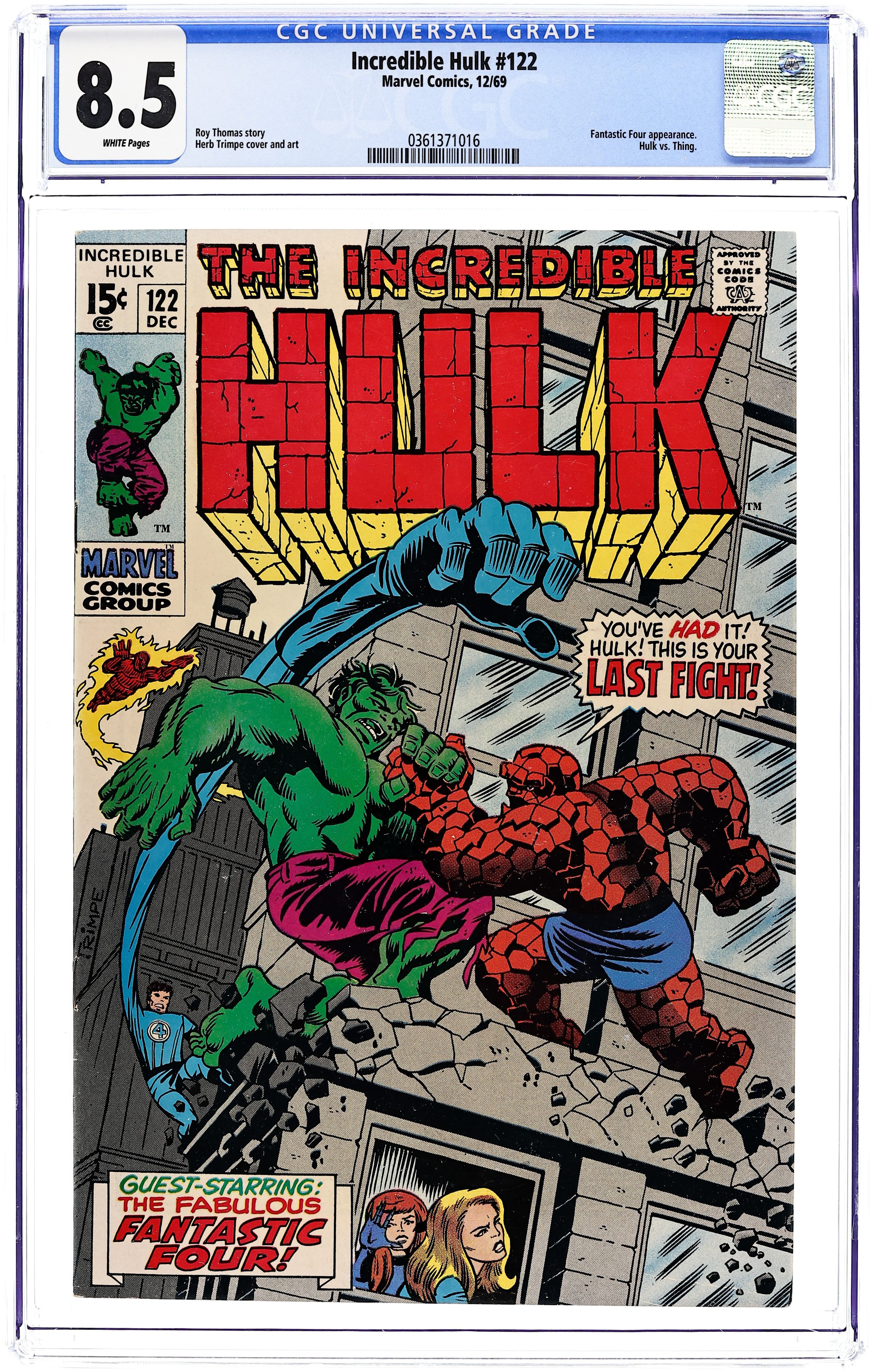 Cover art by Herb Trimpe. The Hulk's Last Fight!, script by Roy Thomas, art by Herb Trimpe; Despairing after he turns into his human alter ego and finds that the Hulk has destroyed a train for no apparent reason, Bruce Banner finds a newspaper headline that asks him to come to New York as Mr. Fantastic believes that he has discovered a way to do away with the Hulk for good; Riding the rails to the Big Apple, Bruce tries to jot some notes of his own regarding Reed's process and secures them to his waist as he finds himself transforming once again into the Hulk to face down some pesky hoboes; By the time he makes it to the Baxter Building, our hero is once again in the form of Bruce Banner but an irate security guard makes his metabolism race and he changes into his monstrous alter ego; During Hulk's battle with the F.F., Sue notices as the pouch with Bruce's notes falls from the Hulk's waist and the Thing is called on to keep the jade giant occupied while Reed uses the new information to modify his weapon design in trying to banish the Hulk for good. 36 pgs. $0.15. Cover price $0.15.