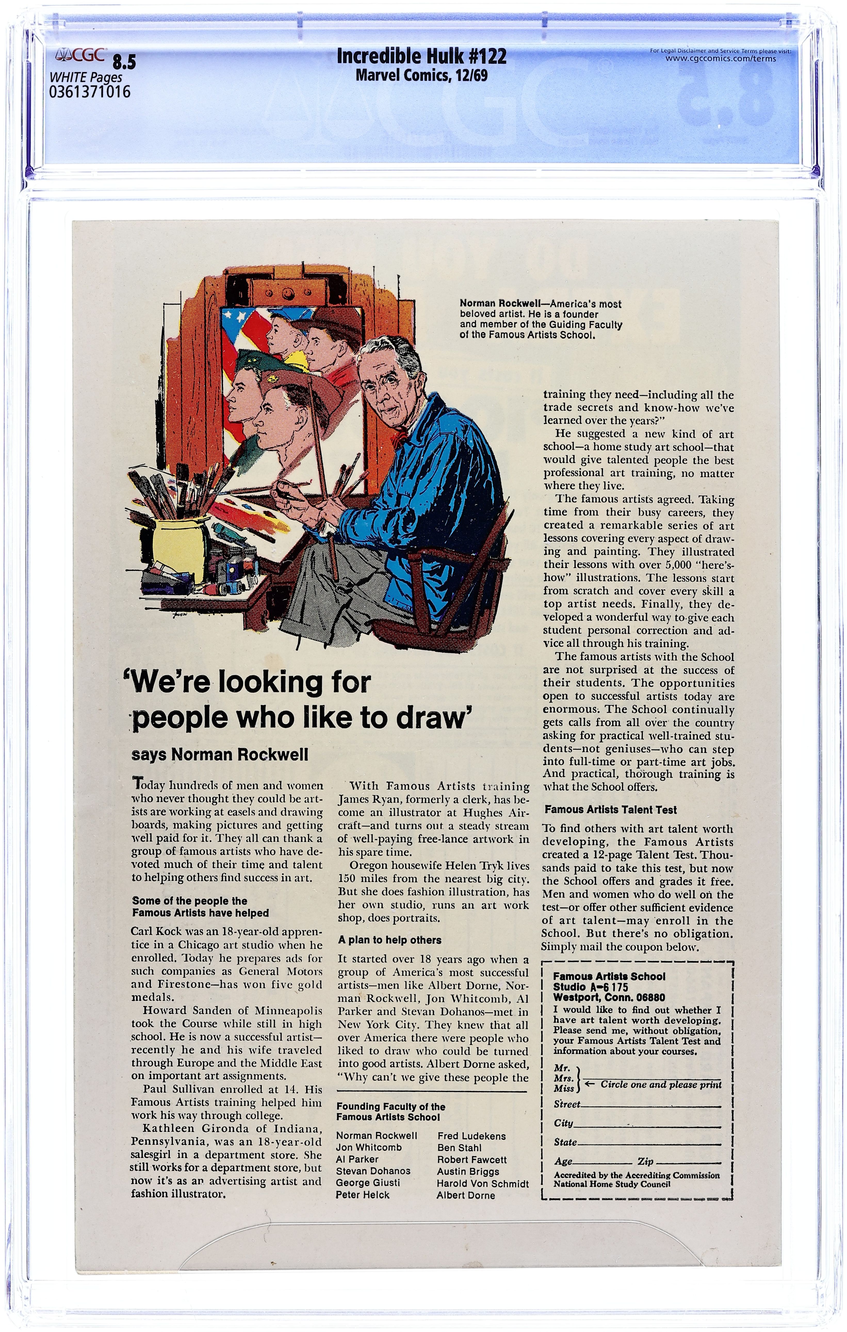 Cover art by Herb Trimpe. No More the Monster!, script by Roy Thomas, art by Herb Trimpe; Mr. Fantastic uses a machine on the Hulk that turns him back into Bruce Banner and allows him to transform into the Hulk at will while still retaining his own intellect; Bruce vows never to become the Hulk again and reunites with Betty who accepts his proposal of marriage; Thunderbolt Ross also makes nice with his soon to be son-in-law but asks him to become the Hulk one last time to protect a new and deadly military weapon during transport; The Leader tries to steal the weapon but is stopped by the Hulk who finds himself feeling more savage as he almost kills his deadliest foe. 36 pgs. $0.15. Cover price $0.15.