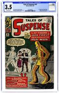Starts Jan 3 Cover pencils by Jack Kirby, inks by Sol Brodsky. Iron Man gets a snazzy new costume in "The Mysterious Mr. Doll!", script by Stan Lee, pencils by Steve Ditko, inks by Dick Ayers; Mister Doll uses magic dolls to take over whole companies; Iron Man stops him with the help of a new suit of armor. "The Pact," art by Joe Maneely; An historian writing about the trial and execution of his ancestor for witchcraft interviews the only remaining party concerned in the case: the Devil. "Kraddak," script by Stan Lee (plot) and Larry Lieber (script), pencils by Larry Lieber, inks by George Roussos (as G. Bell); An alien tells a greedy mine owner that he will be killed in a fall; The mine owner hides at the lowest possible point in his mine. 36 pgs., full color. $0.12. Cover price $0.12.