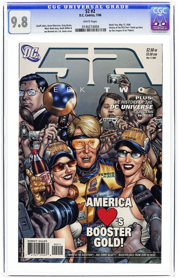 Written by Geoff Johns, Grant Morrison, Greg Rucka, Mark Waid. Breakdowns by Keith Giffen. Art by Joe Bennett, Ruy Jose and Jack Jadson. Backup feature by Dan Jurgens & Art Thibert. Covers by J.G. Jones. After the INFINITE CRISIS and before One Year Later, the DCU spent a year without Superman, Batman and Wonder Woman. A year in which those heroes were needed more than ever as the fate of the world hung in the balance. Who stood up in their absence? And who sat out? The story of DC's most eventful year ever can now be told as four of the hottest writers in comics - Grant Morrison, Geoff Johns, Greg Rucka, Mark Waid - deliver an unprecedented weekly tale of death, danger, romance, intergalactic terror and the never-ending, universal meaning of heroism. Joined by storyteller Keith Giffen and cover artist J.G. Jones, 52 features art for the first month by Joe Bennett, Ruy Jose, and Jack Jadson. Also, starting in Week #2: 'The History of the DC Universe,' a 10-part backup feature by Dan Jurgens and Art Thibert that takes you on a tour through the legendary past of the DCU. 52: A year without Superman; a year without Batman; a year without Wonder Woman...but not a year without heroes. Cover price $2.50.