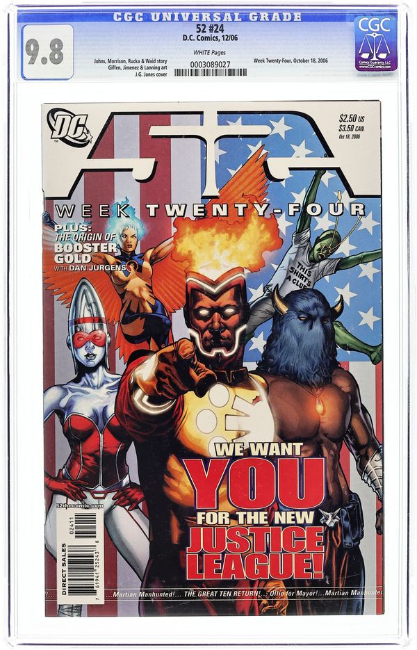 Written by Geoff Johns, Grant Morrison, Greg Rucka, Mark Waid. Breakdowns by Keith Giffen. Art by various. Backup features by Mark Waid and Dan Jurgens. Covers by J.G. Jones. The story of the year continues in four more chapters of America's only weekly super-hero adventure! WEEK 24: 'You don't really know me, but I'm a big fan and ...well... I wanted to invite you to ...to ...to join the new Justice League.' Plus, the Origin of Booster Gold. Cover price $2.50.