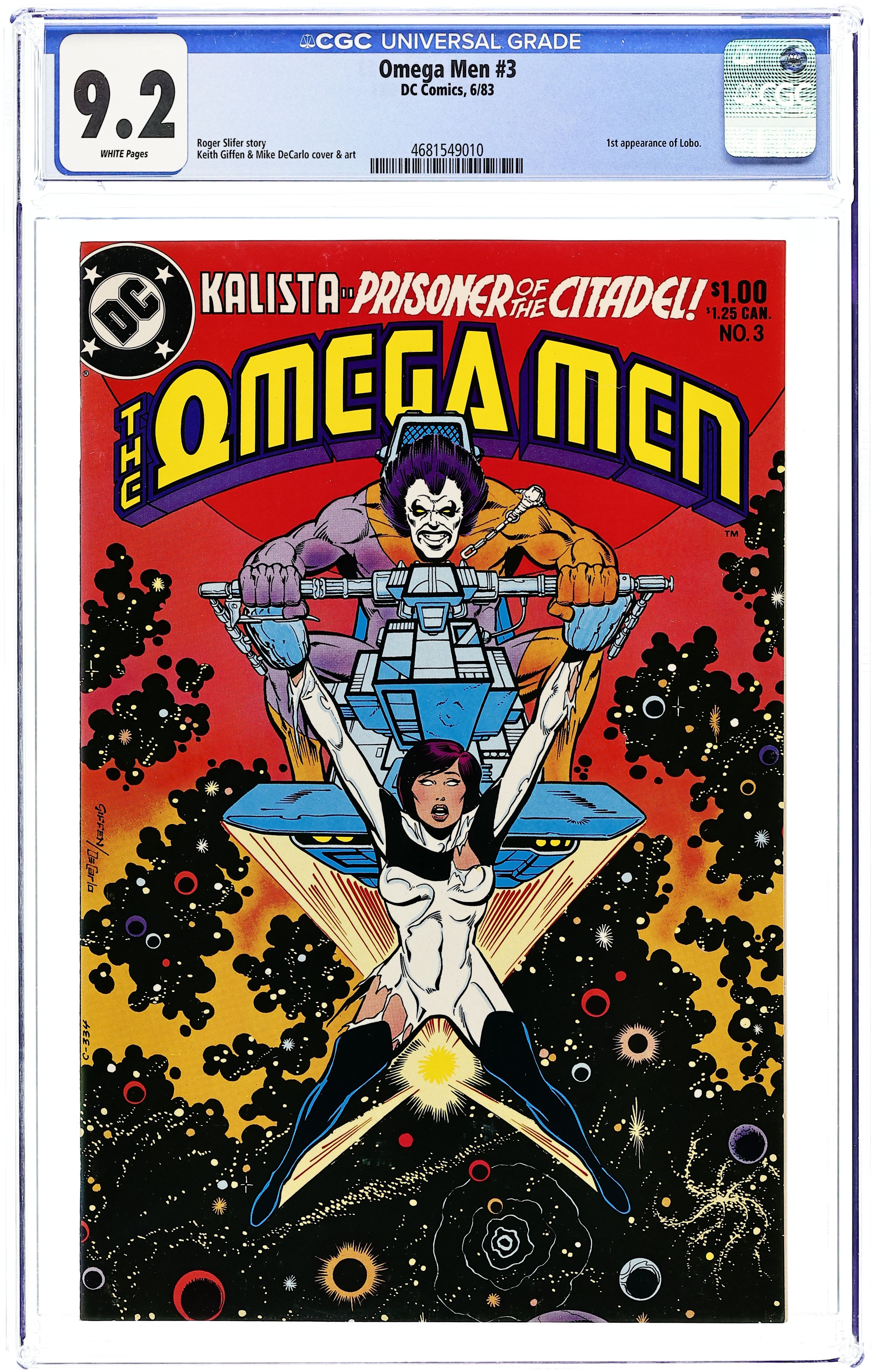 First appearance of Lobo. "Assault on Euphorix." Harry Hokum interrogates Kalista. The Omega Men try to keep the Citadel from taking over Euphorix. Chapter two of the Citadel War. Script by Roger Slifer, pencils by Keith Giffen, inks by Mike DeCarlo. Cover by Giffen and DeCarlo. Cover price $1.00.