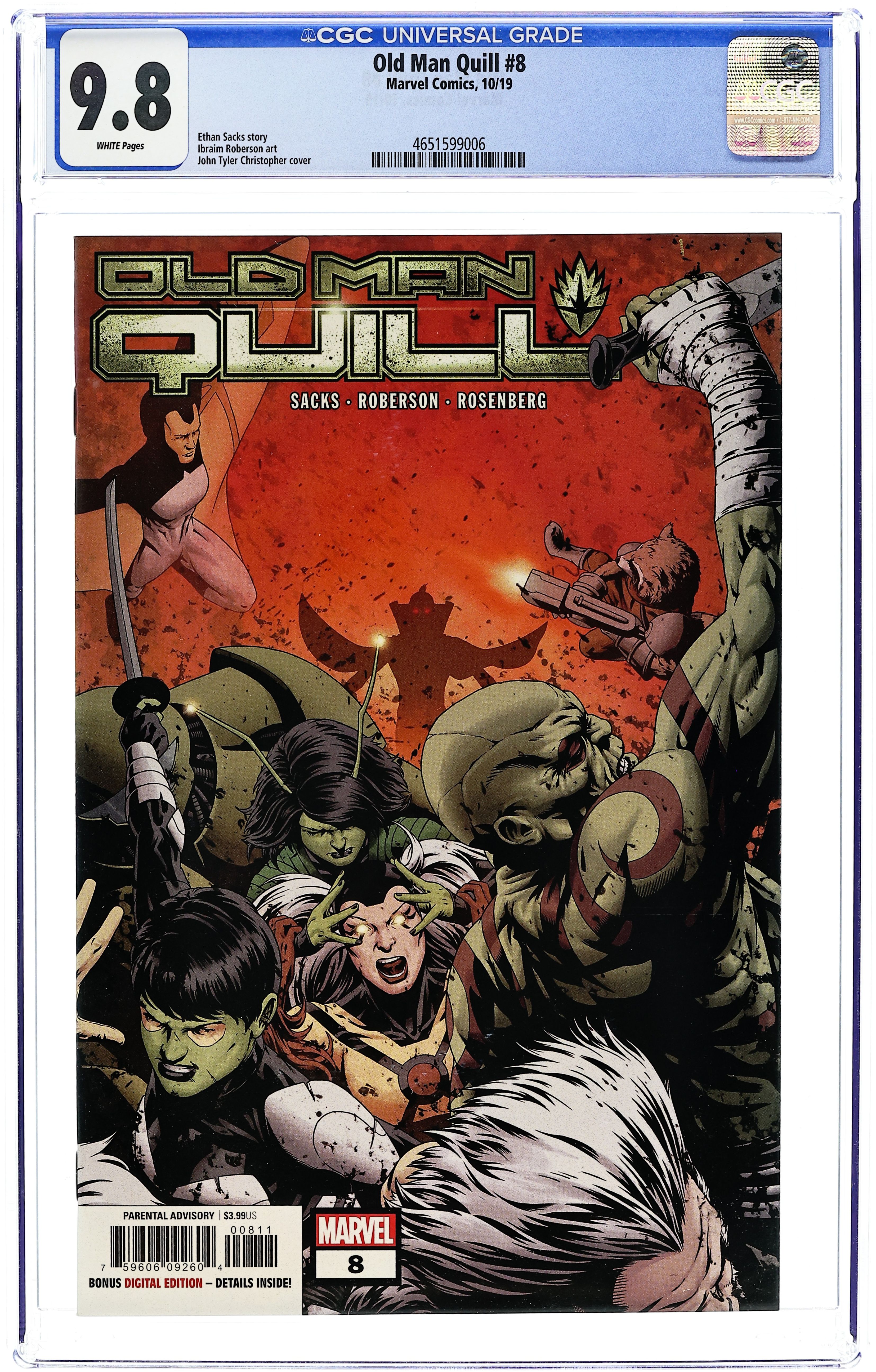 Written by Ethan Sacks. Art by Ibraim Roberson. Cover by John Tyler Christopher. THE FATE OF THE GUARDIANS OF THE GALAXY! The fallout from issue #7 takes the quest in an unexpected direction! The GUARDIANS OF THE GALAXY face their final mission! And what is the secret message Peter Quill would rather forget? 28 pages, full color. Parental Advisory Cover price $3.99.