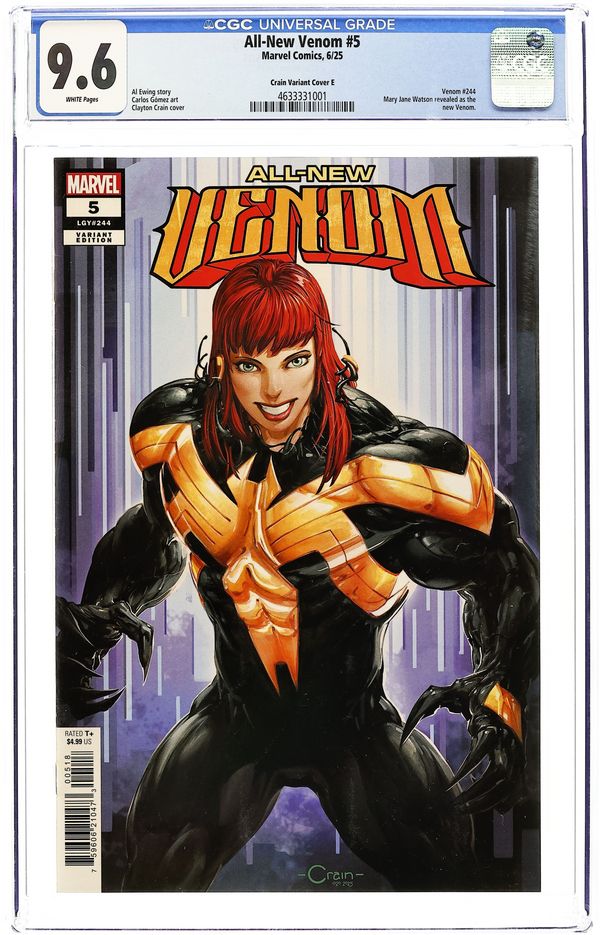 Surprise variant cover by Clayton Crain. Written by Al Ewing. Art by Carlos Gomez. Cover by Clayton Crain. WHO IS THE ALL-NEW VENOM…REVEALED?! When all the red herrings have been weeded out - who's left? The clues have been in front of you the whole time - and by the end of this issue, you WILL know the name of the ALL-NEW VENOM...but with M.O.D.O.K. out for symbiote blood, you might just be identifying the corpse! NOTE: Issue will be unbagged for grading. 32 pages, full color. Rated T+ Cover price $4.99.