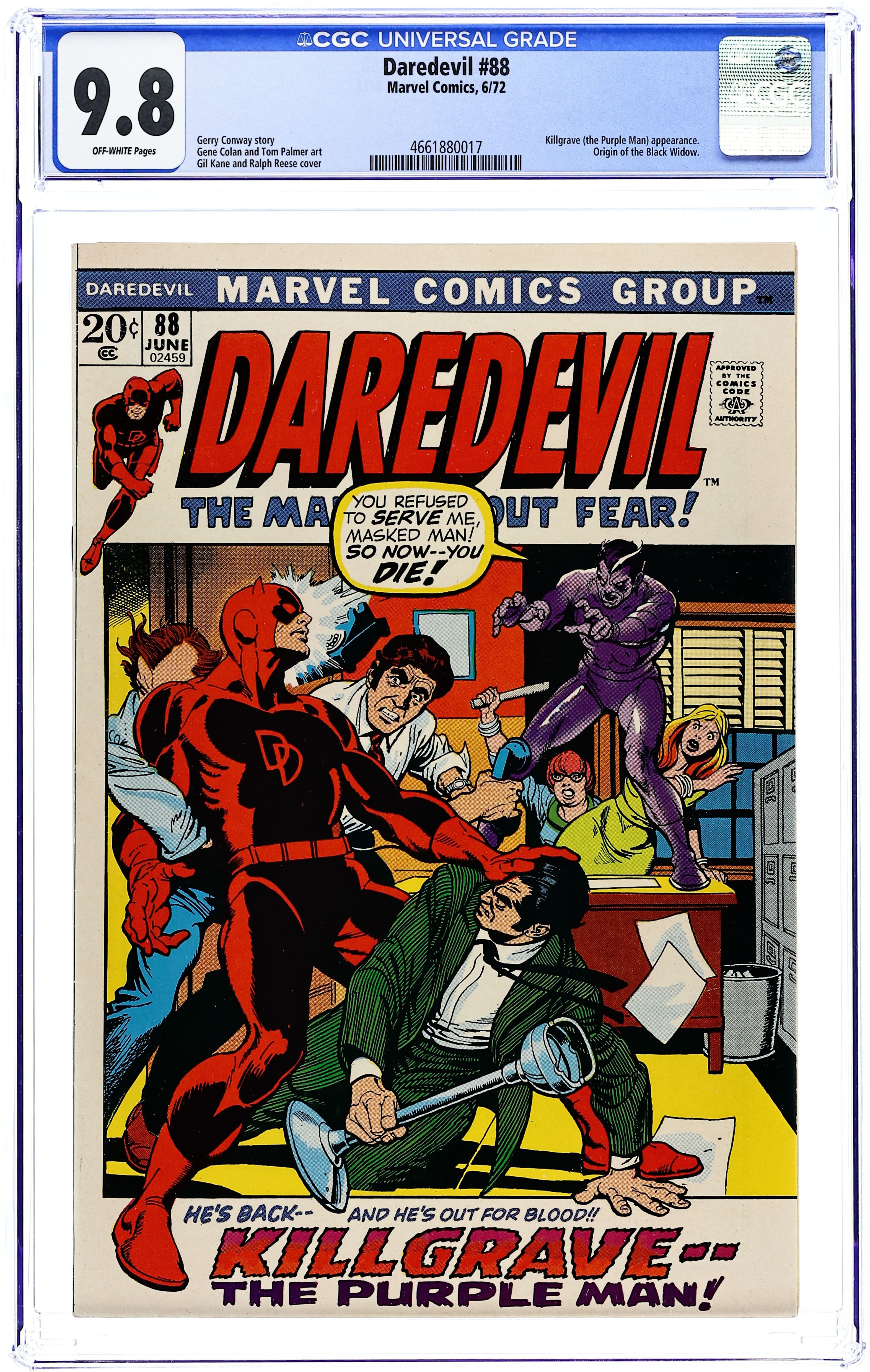 Cover pencils by Gil Kane, inks by Ralph Reese. Call Him Killgrave!, script by Gerry Conway, pencils by Gene Colan, inks by Tom Palmer; DD battles the Purple Man; Black Widow reconnects with an old spy buddy; While trying to track down the Widow, Ivan fills DD in on part of her origin story. 36 pgs. Cover price $0.20. Cover price $0.20.