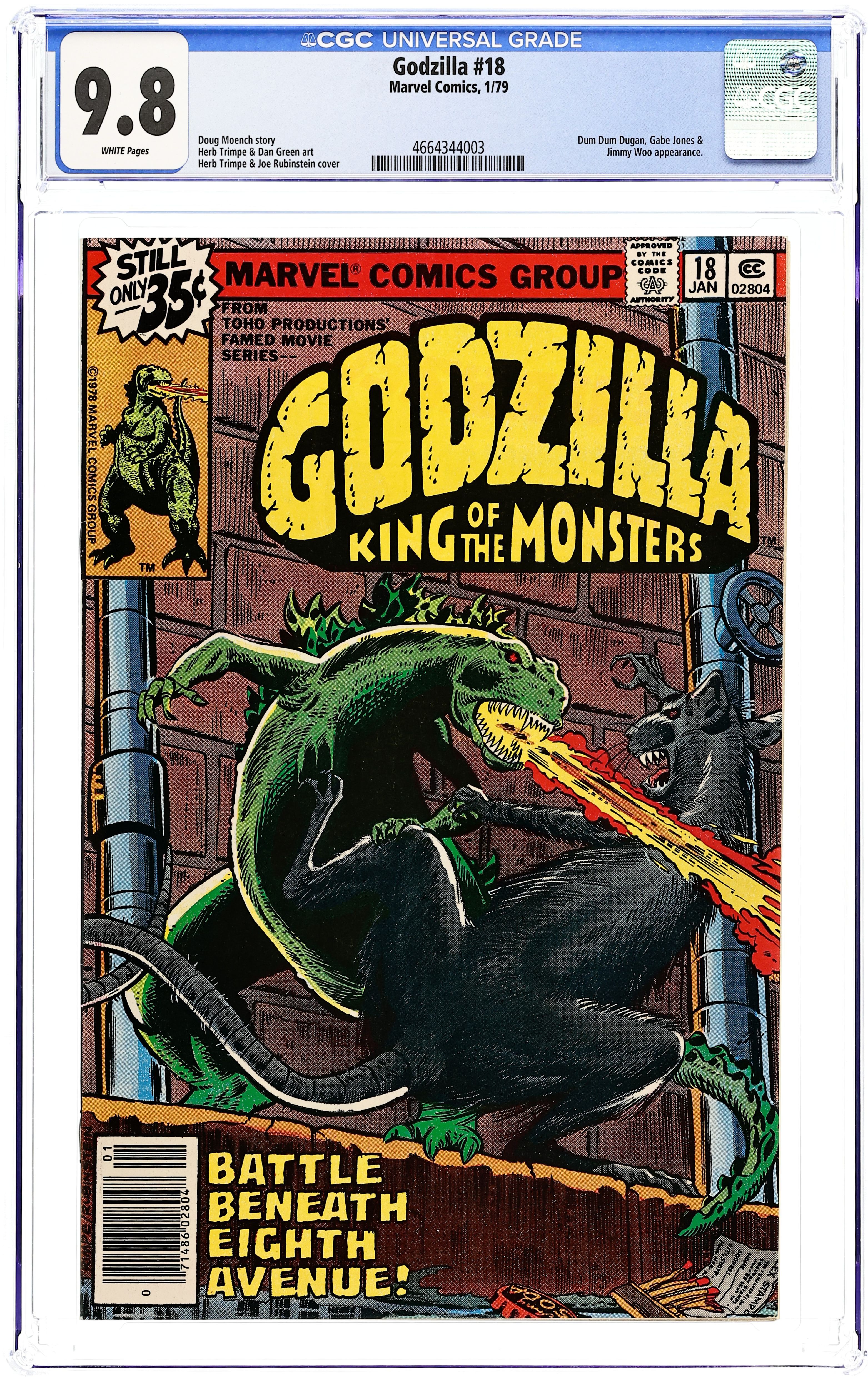 "Fugitive in Manhattan!" Part 2 of 8. Story by Doug Moench. Art by Herb Trimpe and Dan Green. A now diminutive Godzilla escapes his captors and ventures into the sewers of New York City. Here he is confronted by the strange denizens that dwell beneath. Cover price $0.35.