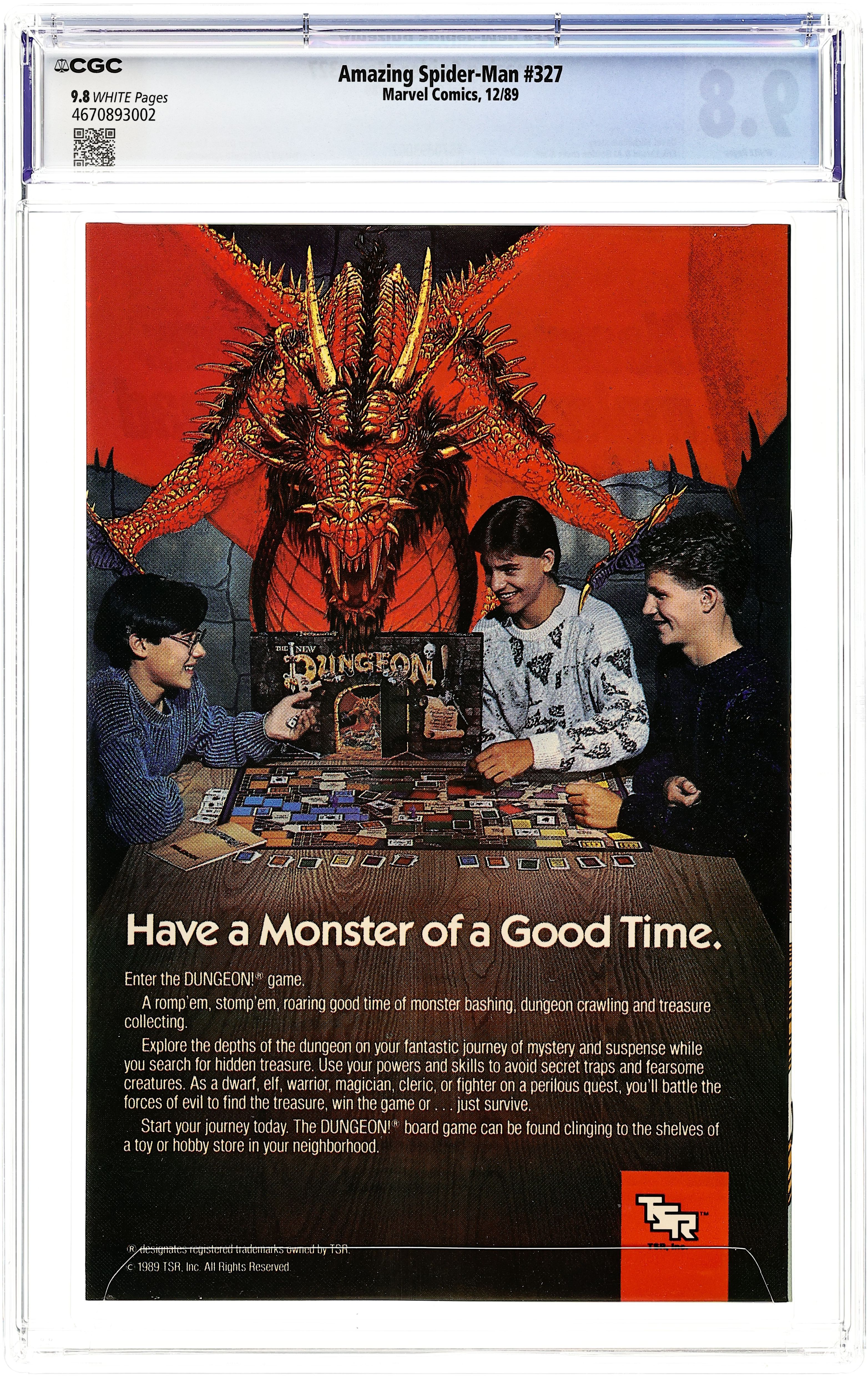 Direct Edition. Acts of Vengeance crossover. 1st cosmic powered Spider-Man. "The Paste and the Power!" Script by Gerry Conway. Art by Sal Buscema (breakdowns) and Mike Esposito (finishes). Cover by Sal Buscema. At the Empire State University physics laboratory, Peter Parker agrees to help Professor Lubisch with an experiment involving extra-dimensional energy transfer. According to the good professor, the experiment is harmless and nothing unexpected will happen. However, the energy transfer overloads the apparatus and flows incredible power into the Amazing Spider-Man! The web-slinger uses his new cosmic power to easily dispatch the Trapster, who had attacked him earlier in the day. Story continues in Web of Spider-Man 59. Cameo appearances by Doctor Doom, Kingpin, Magneto, and the Wizard. 32 pages Cover price $1.00.