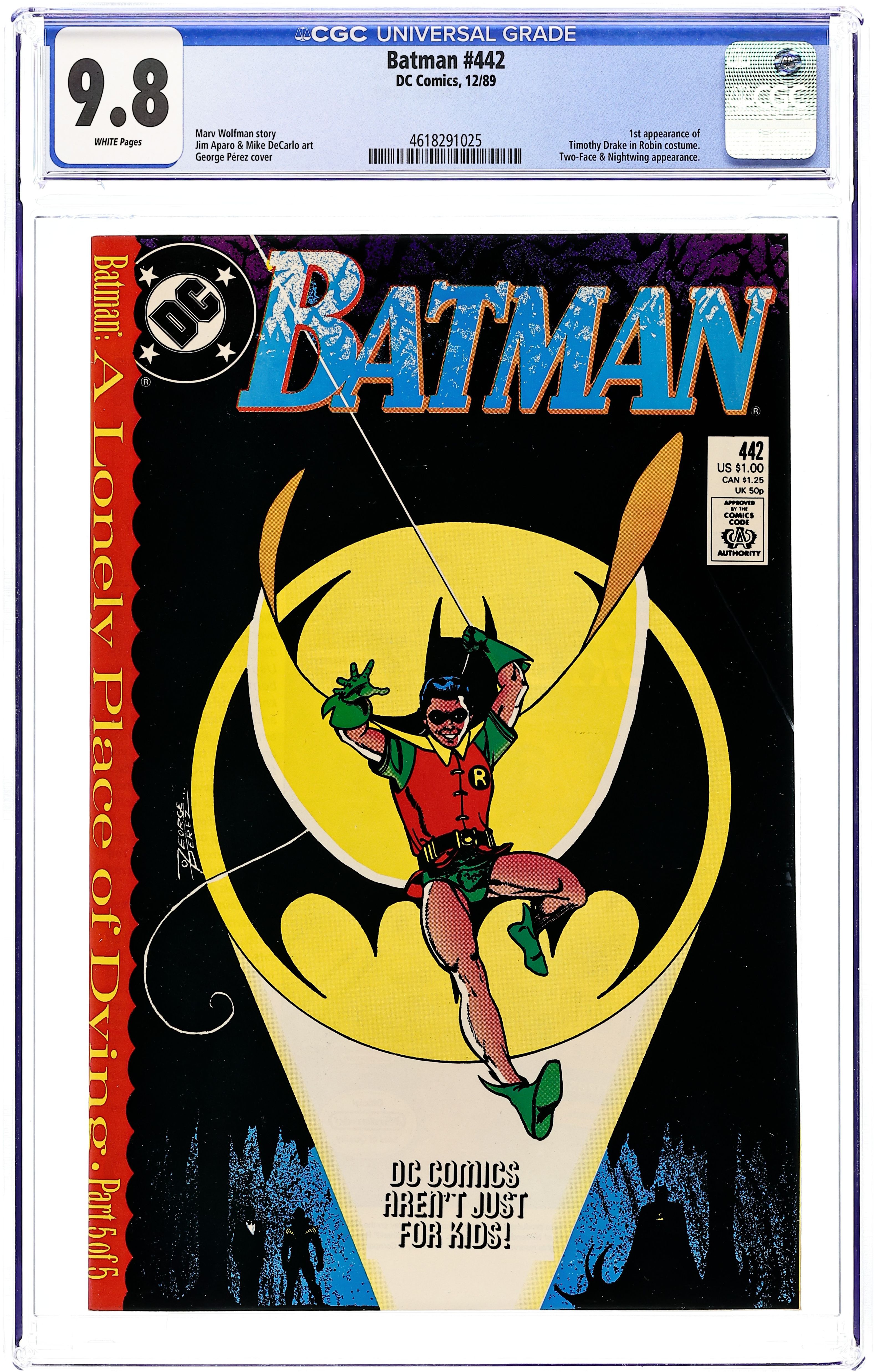 Ends Dec 15 7:46 PM CST Bid History 9 bids Current Bid $58 Your Secret Max Bid If you'd like to bid, please log in or register. First printing. Direct Edition. Cover art by Mike Mignola. "A Death in the Family" part 4 of 4, script by Jim Starlin, pencils by Jim Aparo, inks by Mike DeCarlo; Batman and Superman talk to CIA agent Ralph Bundy about the Joker's diplomatic status; The agent tries to get Batman to leave the Joker alone; Batman goes to the Joker's hotel room; The Joker confirms that he killed Jason; The Joker pulls a gun, but Batman is already gone; At the UN the Joker tries to poison the audience; Fortunately, Superman sucks up all the poison and flies out of the room to release it; The Joker activates bombs; Batman pursues him. NOTE: Most issues from 397-432 were reprinted in 1989 and sold in multipacks. These 2nd and 3rd prints have back cover ads dated 1989. 36 Pages, Full Color. Cover price $0.75.