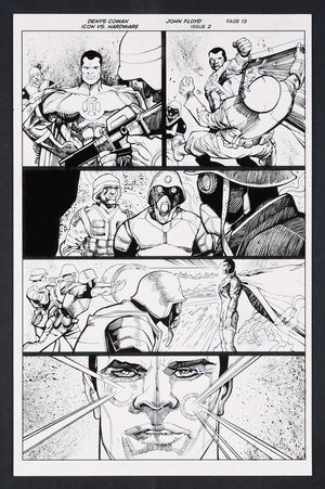 Original Art from Icon vs. Hardware #2 (2023) Page 13 Printed Pencils by Denys Cowan, Inks by John Floyd 2023 DC Less than impressed with these newly manufactured super soldiers, Icon demands that they end their long-running war. After they refuse his request to stand down he decides its time for a more hands on approach. He's not mad he's just disappointed. A fantastic final panel on this page with a close shot of Icon completely unaffected by the bullets and energy blasts. Ink over printed pencils on comic art board. 11" X 17". |