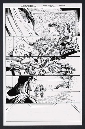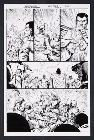 Original Art from Icon vs. Hardware #2 (2023) Page 20 Printed Pencils by Denys Cowan, Inks by John Floyd 2023 DC With the Hardwares thinking they've got the upper hand, Icon takes the gloves off to show them exactly how powerful he is. A great sequence here with Icon breaking free from Hardware's plasma whip and instantly appearing behind the two- no more holding back! Ink over printed pencils on comic art board. 11" X 17". |