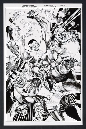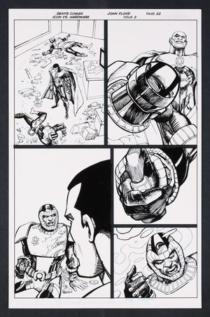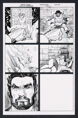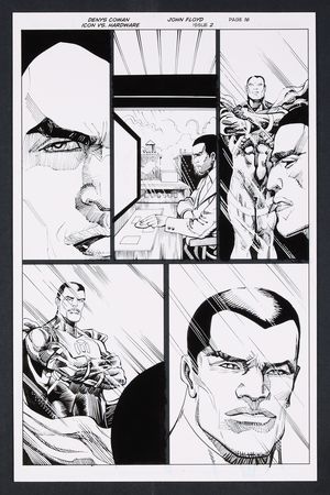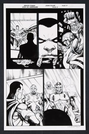 Original Art from Icon vs. Hardware #2 (2023) Page 22 Printed Pencils by Denys Cowan, Inks by John Floyd 2023 DC Out of respect of the beating he just received at the hands of Icon, the time-jumping Hardware goes into exposition mode explaining how he altered the timeline and why. The two come to a bit of an understanding here as Hardware concedes Icon might be right... or not before jumping back into the timestream. Ink over printed pencils on comic art board. 11" X 17". |