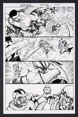 Original Art from Icon vs. Hardware #2 (2023) Page 21 Printed Pencils by Denys Cowan, Inks by John Floyd 2023 DC "You are very smart humans...But still human nonetheless" quips Icon on this awesome splash page that sees the alien hero unleashing on the two Hardwares. It's a powerful image with chunks of armor flying and a fantastic amount of detail, hammering home the power of Icon. Ink over printed pencils on comic art board. 11" X 17". |