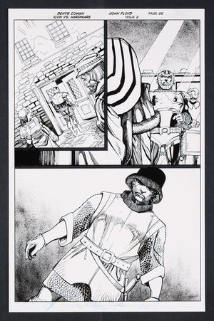 Original Art from Icon vs. Hardware #2 (2023) Page 25 Printed Pencils by Denys Cowan, Inks by John Floyd 2023 DC Convinced by some strong words (and hits) from Icon to undo the changes he made to the timeline, Hardware turns his attention to the MUCH further past, going back to 15th century Portugal. Whatever he's planning, he's gonna look cool as hell while doing it! Ink over printed pencils on comic art board. 11" X 17". |