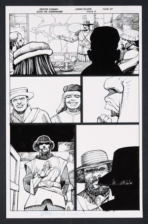 Original Art from Icon vs. Hardware #2 (2023) Page 27 Printed Pencils by Denys Cowan, Inks by John Floyd 2023 DC After his attempt to 'fix' events during his own life didn't work out, Hardware has decided to take even more drastic measures. Travelling to 15th century Portugal intending to stop the slave trade, he's about to meet some unexpected opposition... Ink over printed pencils on comic art board. 11" X 17". |
