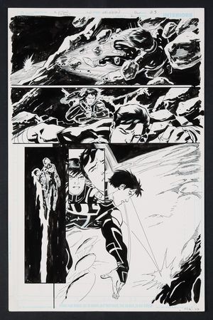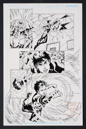 Original Art from Flash #247 (2009) Page 12 Pencils by Jim Calafiore, Inks by Drew Geraci 2009 DC A fantastic 3/4 splash from the final issue of Wally's Flash series! With Linda barely clinging to life, Jai and Iris kidnapped, and his powers on the fritz, Wally is gonna need some help. Thankfully he's got some powerful friends as we see Cyborg, Arsenal, Beast Boy (in bear form), and Nightwing bust into Queen Bee's hideout alongside the Scarlet Speedster to rescue the kids. Pencil and ink on DC comics art board. 11 1/2" X 17". |