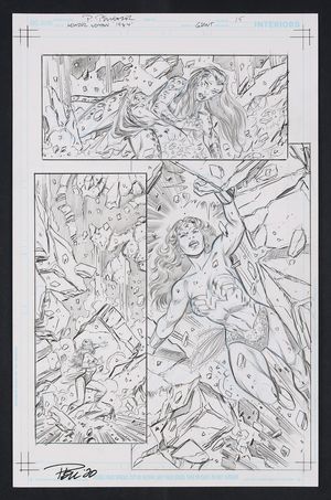 Original Art from Wonder Woman Agent of Peace #8 (2020) Page 15 Pencils by Paul Pelletier 2020 A great page featuring Wonder Woman and one of her most prominent rogues, Cheetah! Exploring a cave on the trail of smugglers, Diana encounters Cheetah who seeks to steal power from an ancient god who it seems is much more powerful than she expected. Energetic, lively, and bold pencils from vet Pelletier and the centerpiece image of Wonder Woman singlehandedly stopping a cave-in is fantastic. Signed by the artist in lower left. Blue line and standard pencil on DC Comics art board. 11" x 17". |
