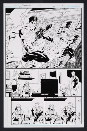 Original Art from Trinity #19 (2008) Page 21 Inks by John Floyd, Printed Pencils by Mike Norton 2008 DC In a world where Batman, Superman, and Wonder Woman never existed, those who remain struggle with both the new order of the world and with visions of what should be. As Firestorm finds his heroics not welcome here, a civilian named Desiree returns home to find her abusive husband unhappy with her drawings of the world before. Ink over printed pencils on DC Comics art board. 11" X 17". |