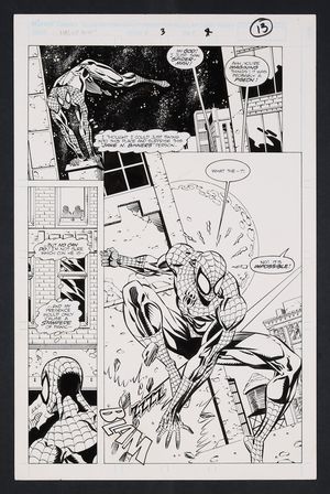 Original Art from Batman Gotham Knights #45 (2003) Page 22B Pencils by Roger Robinson, Inks by John Floyd 2003 DC A page that doesn't exist...kind of! The final three pages of this issue were heavily edited down to two with the only surviving parts of this page being panel two and a portion of panel four. This was likely done to bring down the page count, although it's possible editorial was concerned about the security lapse here as Man-Bat and his son Aaron leave the cave with a framed photo of the entire Bat-family out of costume and in the cave! Pencil and ink on DC Comics art board. 11 1/2" X 17". |