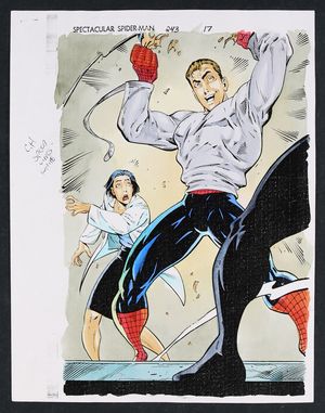 Original Art from Batman Gotham Knights #46 (2003) Page 2 Pencils by Roger Robinson, Inks by John Floyd 2003 In this striking before-and-after shot that also serves as the title splash for this issue, we see how effective the Gotham City correctional system can be by turning the raving madman The Spook into a model citizen eager to reacclimate to society! Surely that's the way this story goes, right? Pencil and ink on DC Comics art board. 11 1/2" X 17". |
