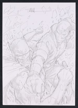 Original Art from Batman Gotham Knights #39 (2003) Page 19 Pencils by Roger Robinson, Inks by John Floyd 2003 DC While Batman and Robin are spending their evening using GPS tracking to hunt down wayward Batarangs, Helena Bertinelli aka Huntress is on the run after escaping from a Checkmate facility and here they collide in spectacular fashion. Insurance is gonna have a heck of a time sorting this one out. Pencil and ink on DC Comics art board. 11 1/4" X 17". |