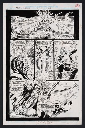 Original Art from Contest of Champions II #2 (1999) Page 21 Pencils by Oscar Jimenez, Inks by Eduardo Alpuente from Contest of Champions II (1999) 2 1999 Marvel Having advanced past several contenders, Johnny Storm has a real challenge on his hands with this round of the contest as he faces the goddess herself- Storm! While it seems like he's a bit outclassed, Johnny makes the surprisingly clever choice to take the battle into some tight spaces which he hopes will trigger Storm's claustrophobia! Signed by Jimenez in top left margin. Pencil and ink on Marvel Comics art board. 11" x 17 1/4". |