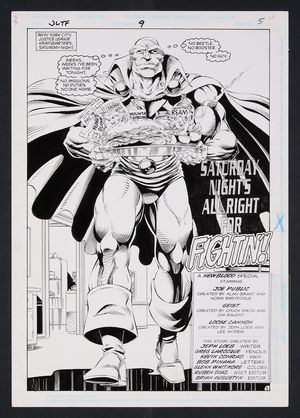 Original Art from Aquaman #5 (1989) Page 14 Layouts by Keith Giffen, Pencils by Curt Swan, Inks by Al Vey from Aquaman (1989 2nd Limited Series) 5 1992 DC A powerful splash page from the climactic issue of this miniseries which saw Aquaman leading a resistance against an invasion of Atlantis perpetrated by giant, genocidal jellyfish! As the Atlantean forces make a last ditch charge to break the siege on Poseidonis, they find themselves aided by a massive army of sea life which is revealed here to be commanded by Aquaman. Swan and Vey do a tremendous job depicting the vast effort expended by the King of Atlantis here, perched atop one of the city's tallest buildings! Pencil and ink on DC Comics art board. 16 3/4" x 11 1/4". |