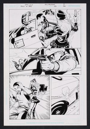 Original Art from Batman #574 (2000) Page 20 Pencils by Dale Eaglesham, Inks by John Floyd 2000 DC It may be the end of the road for Huntress! After losing her mantle as Batgirl and fighting a crazed ex-GCPD officer and his militia she's just sent an army of Joker's goons running. Just when it looks like she's won, BLAMM, a gunshot from The Joker hits her in the side. Pencil and ink on DC Comics art board. 11 1/4" X 17". |