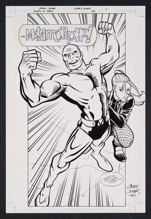 Original Art from Birds of Prey #52 (2003) Page 11 Pencils and inks by Casey Jones from Birds of Prey (1999 1st Series) 52 2003 DC A downright iconic splash page for the Element Man! It also serves as a shocking reveal- in the middle of battle with a merged entity made up of Simon Stagg, Sapphire Stagg, and little Joey it's revealed that Black Canary has not been fighting alongside Java, but Metamorpho himself! Jones' trademark bold, ultra-clean linework shines here, giving an energetic pop-art vibe to the story. Signed by the artist in lower right margin. Pencil and ink on DC Comics art board. 11 1/2" x 17". |