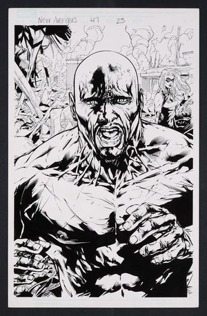 Original Art from Avengers Academy #27 (2012) Page 15 Pencils by Karl Moline, Inks by Jim Fern from Avengers Academy (2010) 27 2012 Marvel Reptil shows off his shapeshifting abilities to the Runaways as the two teams of young heroes await Hank Pym's word that they're ready to rescue Old Lace. Signed by Moline in lower margin. Pencil and ink on Marvel Comics art board. 11" x 17 1/4". |