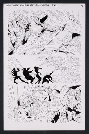Original Art from Notti and Nyce Unidentified Issue (2020) Page 14 In auction ending April 15 2020 A great action page that sees Nastee confronted by Notti, who is actually aiming for the goon standing behind Nastee. Fantastic inking on the headshot in the final panel from Williams! Signed by the artist and top margin. Pencil and ink on art board. 11" x 17". |
