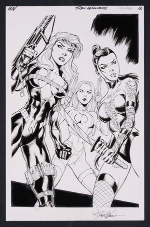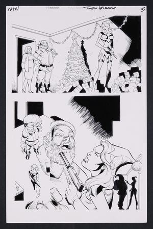 Original Art from Notti and Nyce Unidentified Issue 'Black Friday' (2019) by Ron Williams In auction ending April 15 2019 Notti & Nyce, both dressed as Santa's elves are about to learn the true meaning of Christmas- striking back at those preachy ghosts! Alongside Santa and Ebeneezer Scrooge, the two bad girls face an assault from the ghosts of Christmas Past, Present, and Future! Pencil and ink on art board. 11" x 17". |