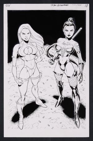 Original Art from Lady Death The Wild Hunt #3 (Unpublished) Page 12 Pencils by Jim Cheung, Inks by Mark Pennington 2004 CrossGen Comics A moody, gorgeously inked page that finds Lady Death in mystical chains as a fight between her captors ensues. Pencil and ink on Crossgen Comic art board. 11" x 17". |