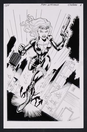 Original Art from Batman Gotham Knights #38 (2003) Page 6 Pencils by Roger Robinson, Inks by John Floyd 2003 DC A great mirror to the title page that immediately precedes this page that saw Huntress in the exact same pose clad in the Bronze Age Huntress costume, here we get the reveal that she's actually locked in a padded cell and being monitored by someone with an affinity for blondes. Pencil and ink on DC Comics art board. 11 1/4" X 17". |