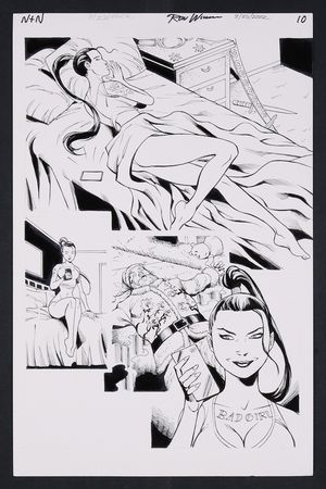 Original Art for Notti & Nyce Holiday Special 2022 Story Page 1 Pencils and Inks by Ron Williams In auction ending April 15 2022 A phenomenal bisected splash of the titular bad girls chatting on the phone opens this story as they get ready for some holiday fun- Nyce in a comfy bedroom with a picture of Marilyn on the wall and Notti surrounded by weapons! Signed by the artist in top margin. Pencil and ink on art board. 11" x 17". |
