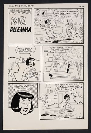 Original Art from Betty & Veronica #23 (1989) Page 29 Pencils by Dan DeCarlo, Inks by Jim DeCarlo from Betty and Veronica (1987 1st Series Archie) 23 1989 Archie Publications Veronica is furious after calling Archie and getting his answering machine (she refuses to talk to machines), Betty comes up with an absolute ingenious solution to the problem! Pencil and ink on Archie Comics art board. 11 1/2" x 17 1/2". |