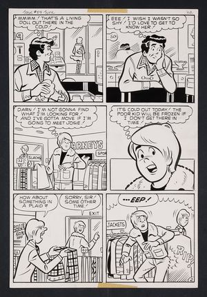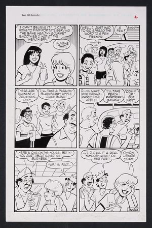 Original Art from Betty #89 (2000) Page 6 Pencils by Dan DeCarlo, Inks by John Lowe from Betty (1992 Archie) 89 2000 Archie Publications Though a heat wave should create prime conditions for an ice cream purveyor like Pop, Veronica Lodge's wellness-influencing has kept the crowds away. Thankfully, Betty introduces Pops to the concept of fruit smoothies, packing the booths at Pop's! Pencil and ink on Archie Comics art board. 11 1/4" x 17 1/4". |