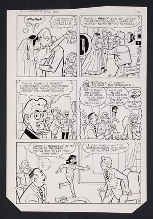 Original Art from Archie's Girls Betty and Veronica #343 (1986) Page 12 Pencils and Inks by Dan DeCarlo from Archie's Girls Betty and Veronica (1951) 343 1986 Archie Publications The wedding of Veronica Lodge! Well, kind of. Ronnie's begging convinces her father to allow the hit soap "Secaucus" to film in Lodge mansion, as well as landing her a role as J.R. Wingding's soon-to-be-dead bride. Will the glitz and glamour of TV production be everything Veronica hopes? No, no it won't. Pencil and ink on Archie Comics art board. 11 1/4" x 16 1/2". |