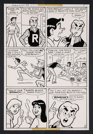 Original Art from Archie #277 (1979) Page 5 Pencils by Dan DeCarlo Jr., Inks by Jim DeCarlo from Archie (1943 Archie Comics) 277 1979 Archie Publications Ever the people pleaser, Archie Andrews refuses to join the rest of the gang in their rejection of Lunchlady Beazly's Chicken Supreme (also known as Miss Beazly's Fowl Slop). A nice panel page featuring the whole gang and closing with a great closeup panel of a determined Archie! and ink on comic art board. 10 1/2" x 15 3/4". |