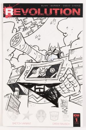 Soundwave (Transformers) Sketch by Drew Rausch on Revolution (2016 IDW) 1RI.D In auction ending February 27 2016 Originally issued as a 1:100 retailer incentive variant for the first issue of Revolution. Signed by the artist. Pencil and ink on sketch cover. |