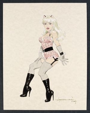 Tigress Sketch by Mike Hoffman In auction ending February 27 2004 A fantastic piece from Hoffman, known for his feline females! It's a stunner with the heavy, blocky blacks of the figure's boots and bondage gear contrasting in an eye-catching way with the softer watercolors on the rest of the piece. Signed by the artist. Pencil, ink, and watercolor on heavy paper stock. 8 1/2" x 11". |
