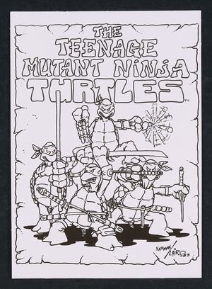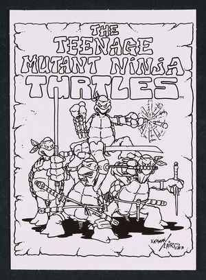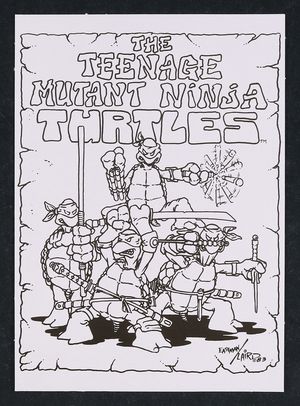 Teenage Mutant Ninja Turtles Print by Kevin Eastman and Peter Laird In auction ending February 6 2010s A reproduction of the original TMNT sketch by the creators Kevin Eastman and Peter Laird. From Teenage Mutant Ninja Turtles: Original Sketch Collector Figure with comic Book by Playmates Toys High quality print on cardboard. 5" X 7". |