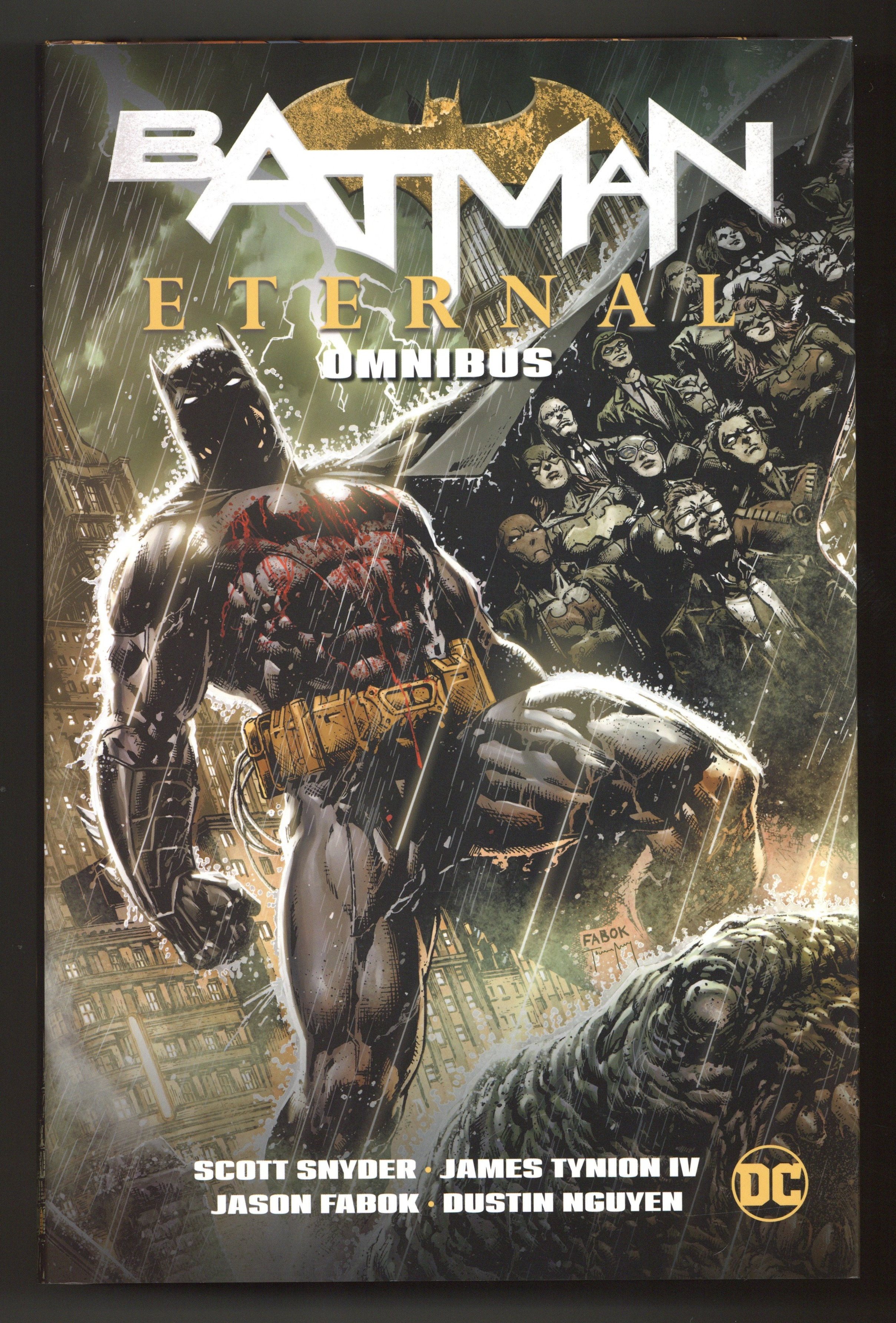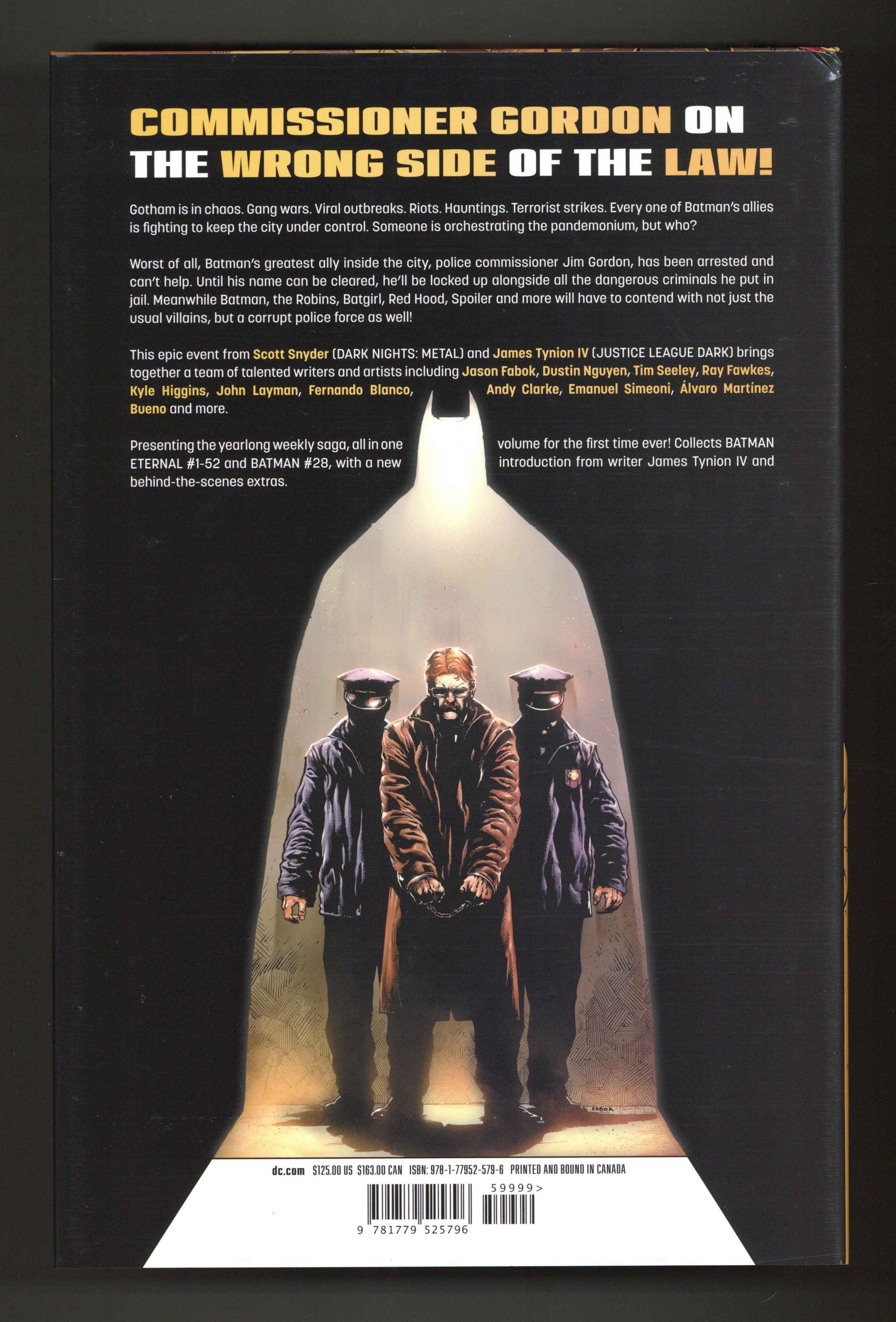 Starts Apr 4 2nd Edition - 1st printing. Collects Batman Eternal (2014) #1-52 and Batman (2011-2016 2nd Series) #28. Written by Scott Snyder, John Layman, James Tynion IV, Tim Seeley Kyle Higgins, and Ray Fawkes. Art by Jason Fabok, Dustin Nguyen, Andy Clarke, Ronan Cliquet, Simon Coleby, Ray Fawkes, Trevor McCarthy, Emanuel Simeoni, Guillem March, Riccardo Burchielli, Ian Bertram, Mikel Janin, Derek Fridolfs, Fernando Blanco, Andrea Mutti, Felix Ruiz, Davide Furno, Joe Quinones, Jed Dougherty, Goran Sudzuka, Roger Robinson, David Lafuente, Aco, Javi Fernandez, Alessandro Vitti, Christian Duce, Juan Ferreyra, Alvaro Martinez, Eduardo Pansica, Robson Rocha, Dustin Nguyen, Paolo Armitano, Raul Fernandez, Julio Ferreira, Javier Garron, R.M. Guero, Scott Hanna, Meghan Hettrick, Jorge Lucas, Gillem March, Victor Olazaba, Fernando Pasarin, Roger Robinson, Matt Ryan, Tim Seeley, and Guillermo Ortego. Cover by Jason Fabok. Introduction by James Tynion IV. Gotham is in chaos. Every one of Batman's allies is fighting to keep the city under control. Someone is orchestrating the pandemonium, but who? Worst of all, Batman's greatest ally inside the city, Police Commissioner Jim Gordon, has been arrested. Until his name is cleared, he'll stay locked up alongside all the dangerous criminals he put in jail. Meanwhile Batman, the Robins, Batgirl, Red Hood, Spoiler, and more will have to contend with not just the usual villains, but a corrupt police force as well! Hardcover, 8 1/2-in. x 11-in., 1,208 pages, full color. Cover price $125.00.