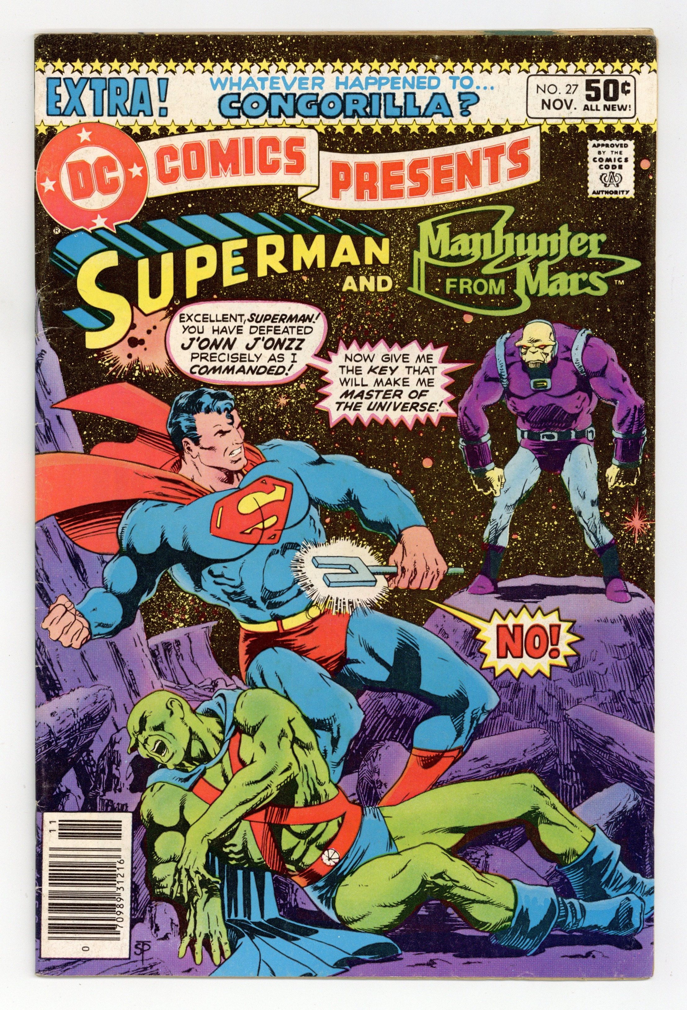 Starts Jan 26 Newsstand Edition. Superman and Manhunter from Mars star in "The Key That Unlocked Chaos!" First appearance of Mongul. Written by Len Wein, with art by Jim Starlin, Dick Giordano and Frank McLaughlin. Characters: Superman; Martian Manhunter [J'onn J'onzz, Manhunter from Mars]; Mongul (intro, villain); Steve Lombard; Jimmy Olsen; Lois Lane; The Warzoon (aliens, flashback); The Largas (aliens, flashback); green kryptonite. Plus: "Whatever Happened to Congorilla?" Written by Bob Rozakis, with art by Romeo Tanghal and Frank Chiaramonte. Characters: Congo Bill; Congorilla; Golden Gorilla; Janu; Mose; K'Bani (villain); Fred Cantrell (villain). Cover by Jim Starlin. Cover price $0.50.